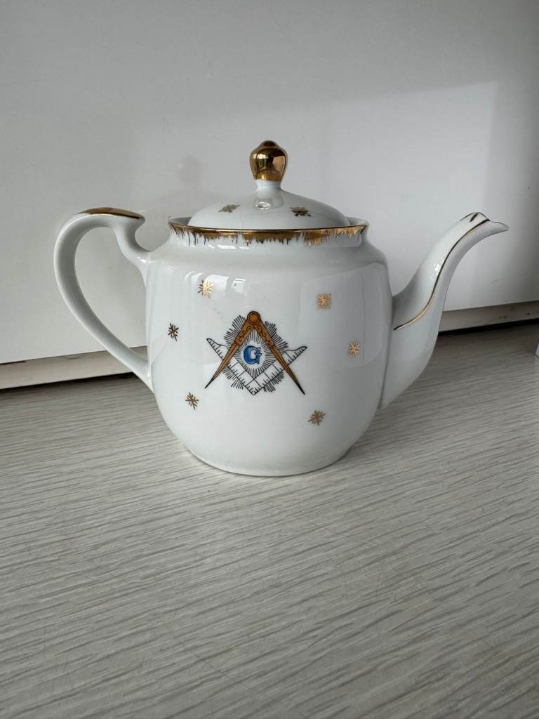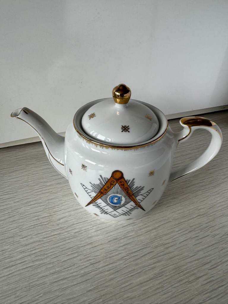 Vintage Masonic Teapot with Compass & Square design with gold accents.