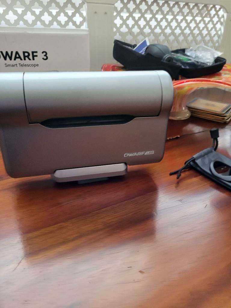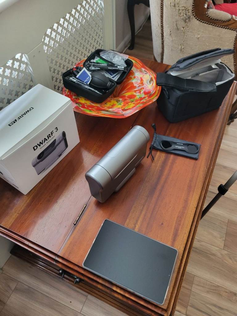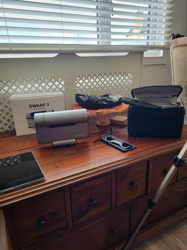 Up for sale is my dwarf 3 smart telescope. Only been used a few times and is like new. Works perfectly and comes with charging cable. sun filter and lenovo tablet. Also trypod for polar alignment... lens cleaning kit also included. This smart telescope is great for deep sky objects sun moon and planets...