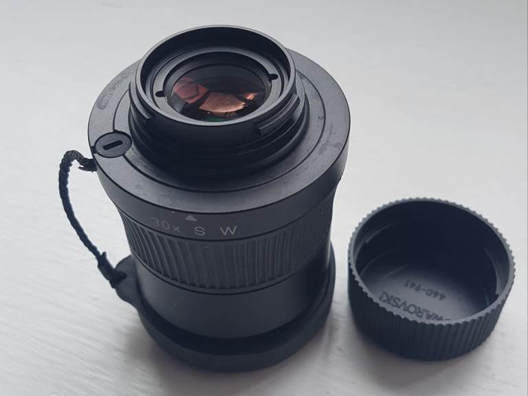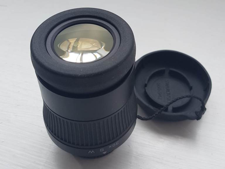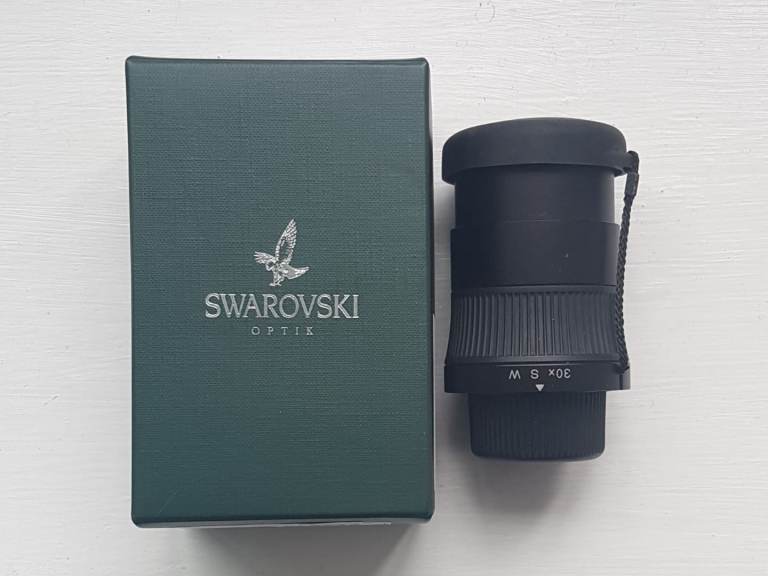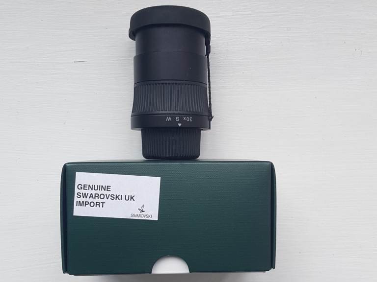 Swarovski 30x SW wide-angle eyepiece, boxed with no marks on the lenses and comes with both lens caps. I think the Swarovski 30x SW eyepiece is the best fixed eyepiece ever produced and is very hard to find for sale nowadays. There are no marks on the optics, no fungus on the optics and no condensation on the optics, the optics are crystal clear, like new. The 30x SW fixed magnification eyepiece has a superb field of view and, due to it being very bright and crystal-clear, make it the best eyepiece for viewing and digiscoping.