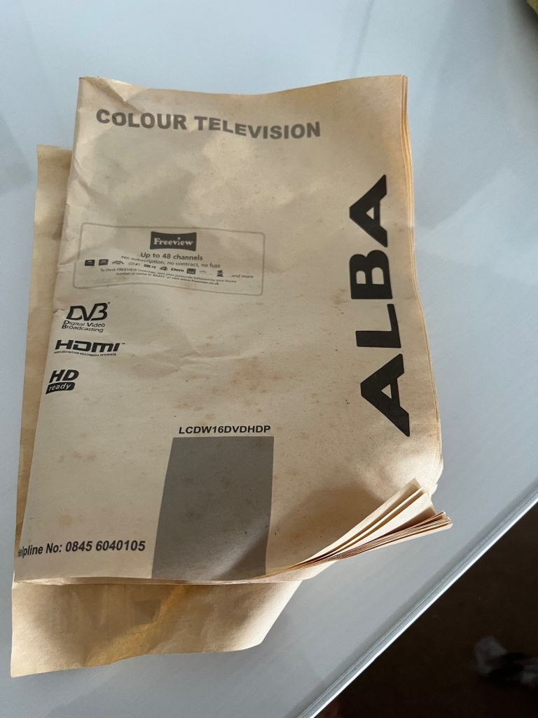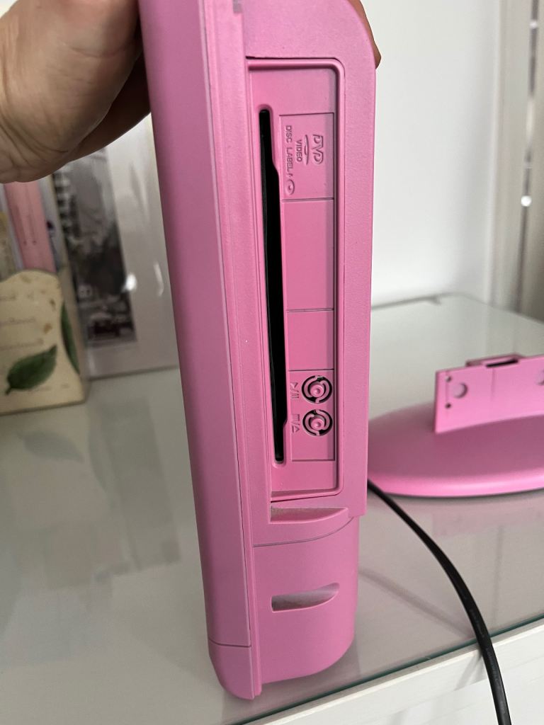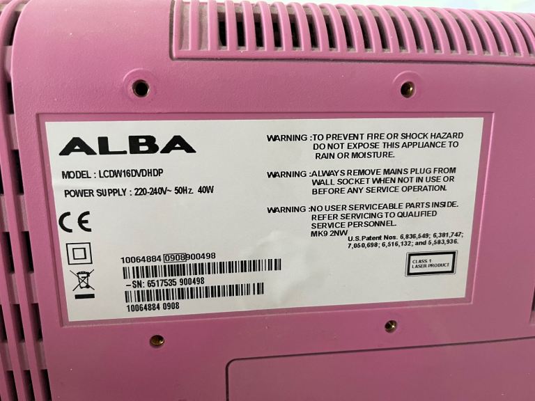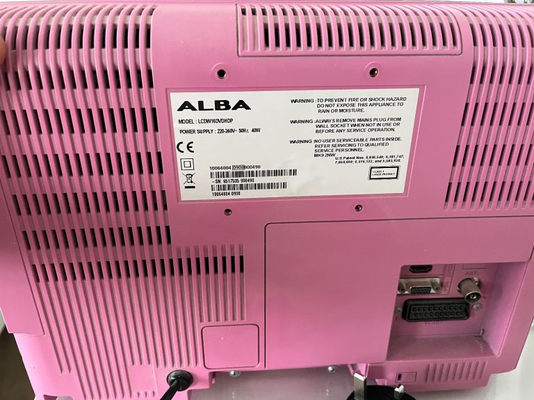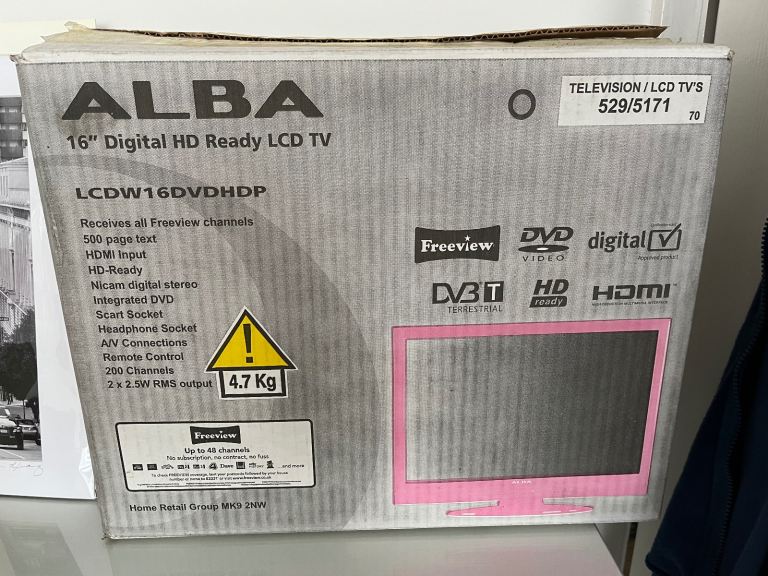 Pink 16” Alba Digital HD Ready LCD TV with DVD and Freeview, with remote control and box and stand. In good working order.