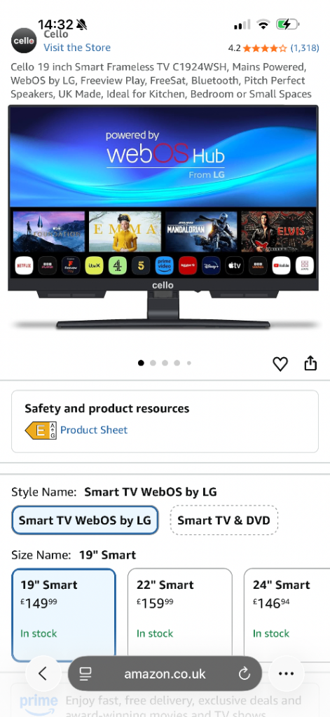 C1924WSH, Mains Powered, WebOS by LG, Freeview Play, FreeSat, Bluetooth, Pitch Perfect Speakers, UK Made, Ideal for Kitchen, Bedroom or Small Spaces