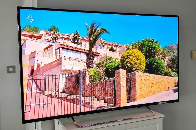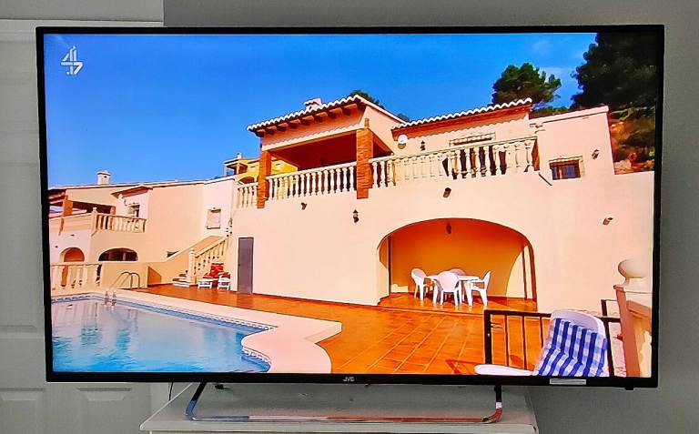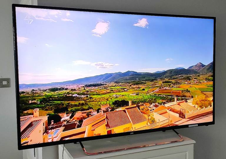 This stylish ultra slim and lightweight black & chrome huge size screen 55" jvc full hd 1080p led tv is in full working order and is in a fantastic clean new looking scratch and mark free condition with an absolutely stunning picture (as seen in the photos). It has built in freeview channels as standard and is also firestick and gaming compatible so you can connect to the internet wirelessly to receive all apps via the firestick. It comes complete with the jvc remote control (as seen in photo 4) power cable and stylish chrome stand stand again all in immaculate scratch and mark free condition.