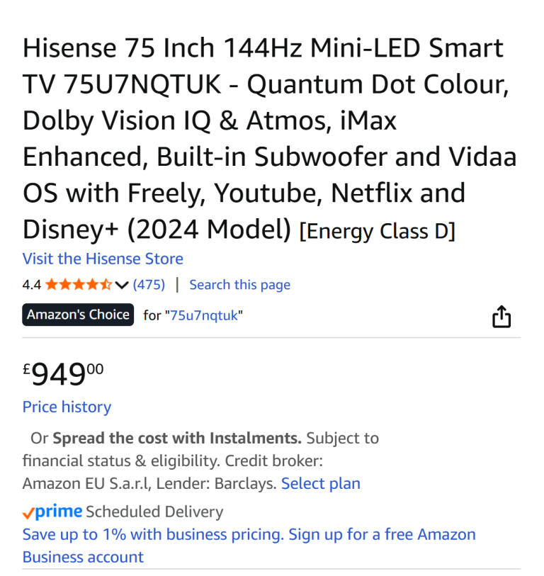 Hisense 75U7NQTUK MINI LED. DOLBY ATMOS/VISION 2024. PERFECT CONDITION. WAS ORIGINALLY £1800 IN 2024.