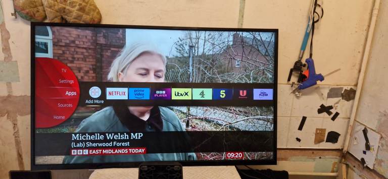 Features include Netflix, Prime Video, Freeview Play, and YouTube, all accessible from the smart menu.