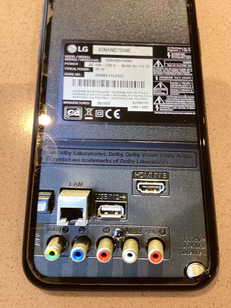 This is an LG Nano cell television with a 43 inch screen, remote control and flat wall mounted bracket. It is in perfect working order and has only been on the wall in the spare bedroom, it is now surplus to requirements. Can be seen working, it’s much better than my photos.