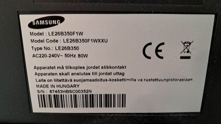 Good condition. Complete with remote control. Screen measures 26 inches diagonally. Suitable for a kitchen or bedroom.