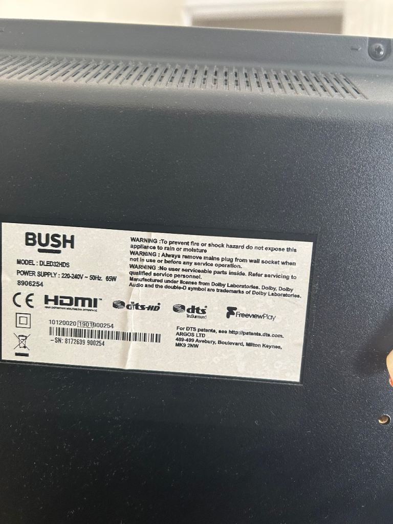 Bush 32-inch television, model DLED32265, working well and ready for a new home.