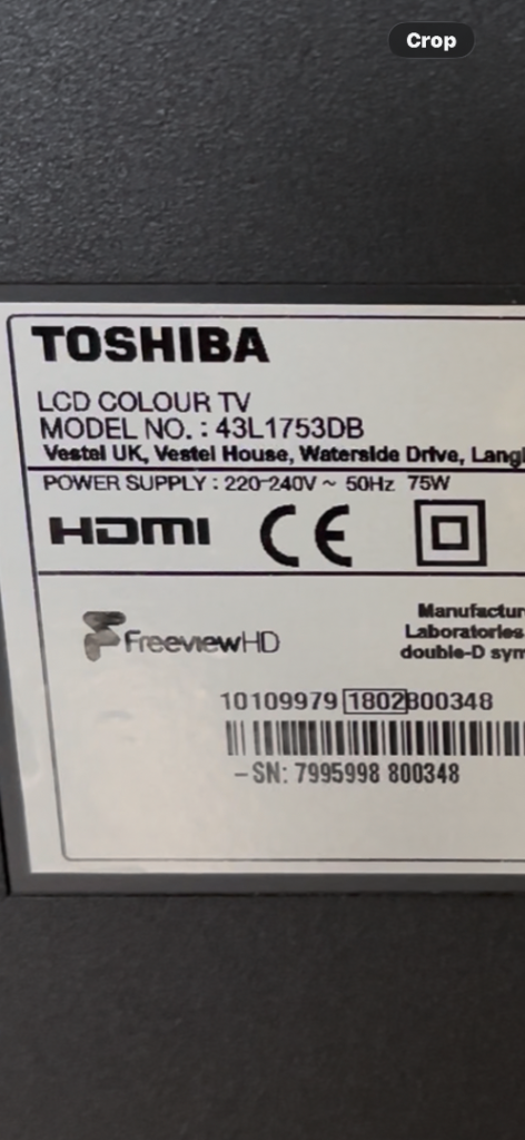Toshiba 43 inch TV. No remote but all functions available via manual button