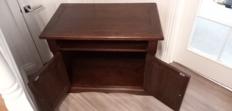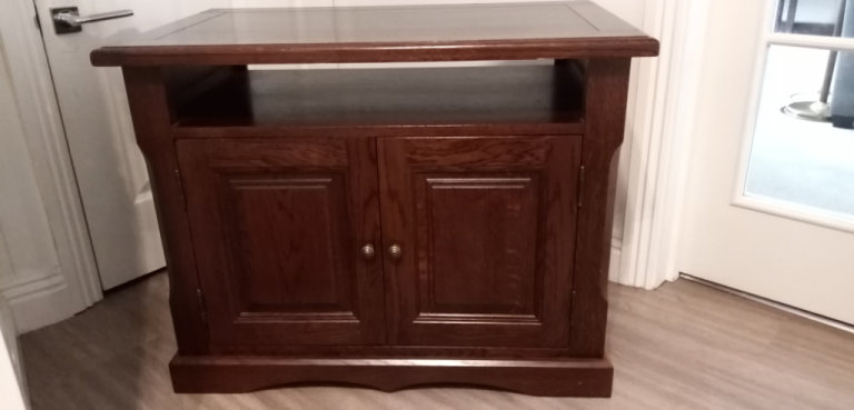 High quality TV cabinet made of solid wood by superior craftmanship. This TV cabinet is large enough to hold a decent size LED, LCD or Plasma TV. A great way to hide your DVD player, Sky box or Blu Ray player. Keeping them safe for childrens hands. This TV cabinet can also store DVD and CD collections and to hide cables and HDMI leads. Measures 80 X 48 X 62 cm in very good condition. A very nice piece of furniture.