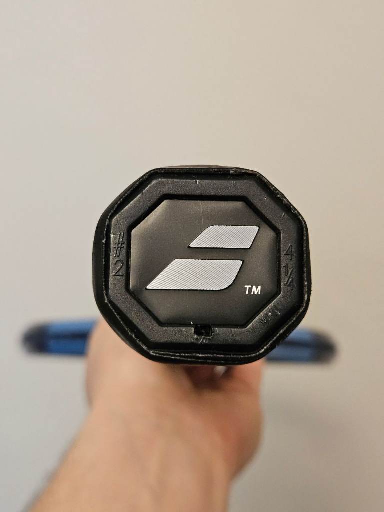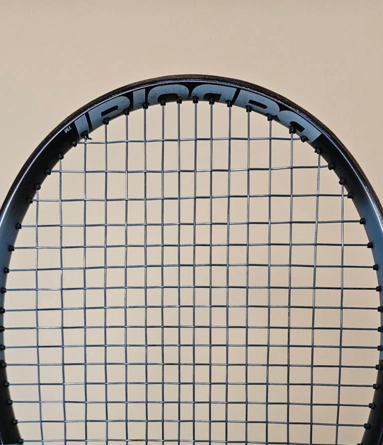 Freshly strung with Babolat ALU Power 1.25mm at 23kg. You can see the ALU Power lettering clearly on the strings confirming the fresh job. A fresh black overgrip has also been applied over the original grip.