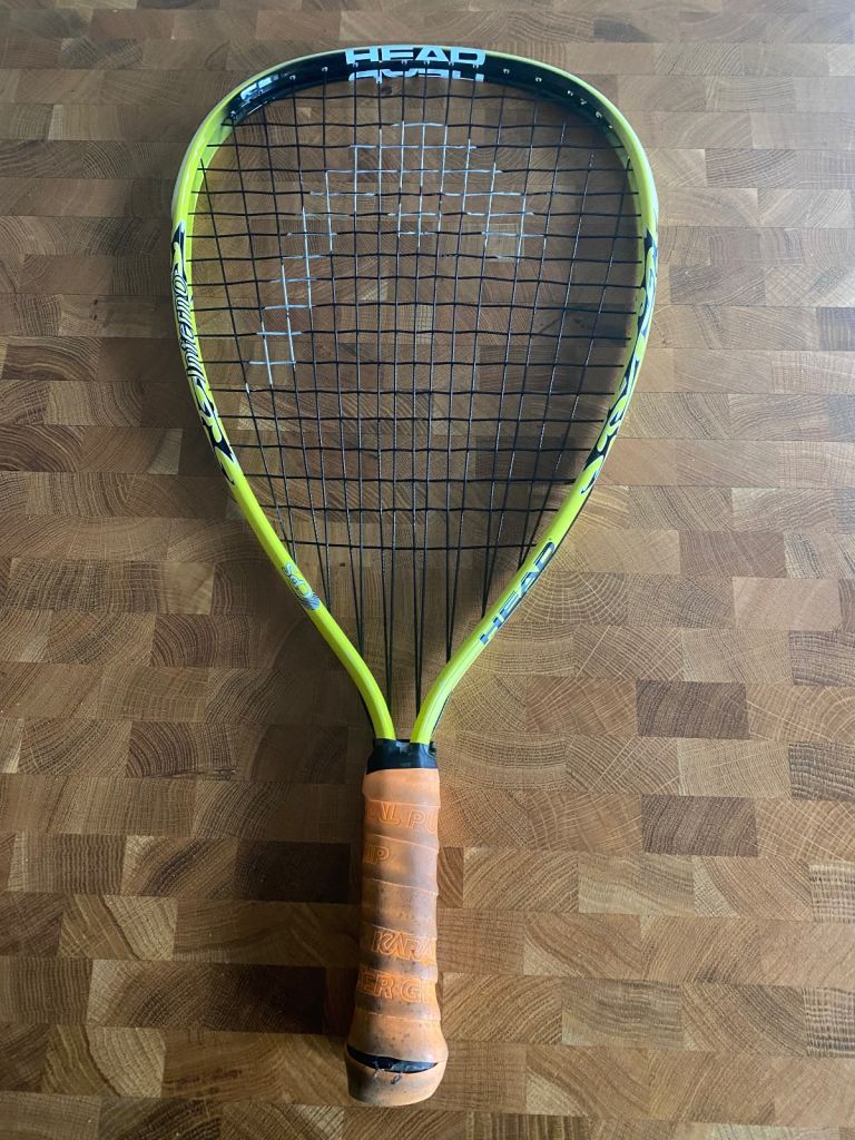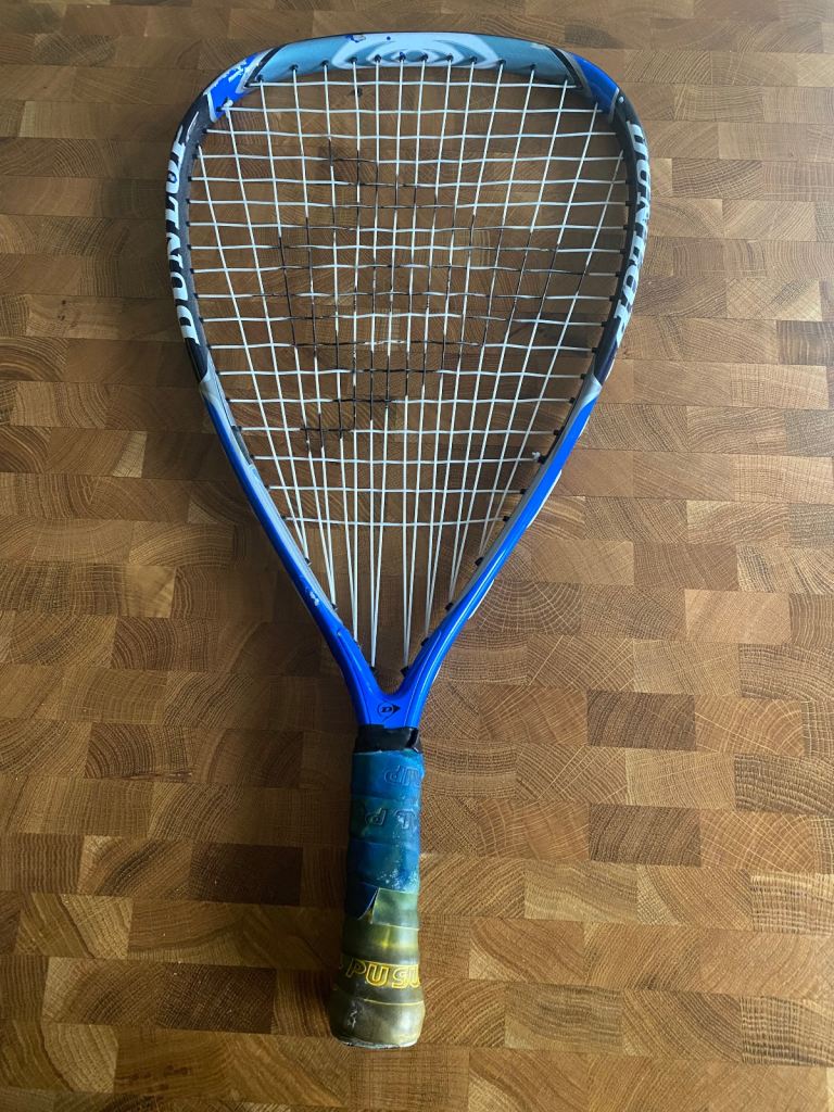 One Head racquet and one Dunlop racquet. Both in very good condition. With one blue racquet ball.