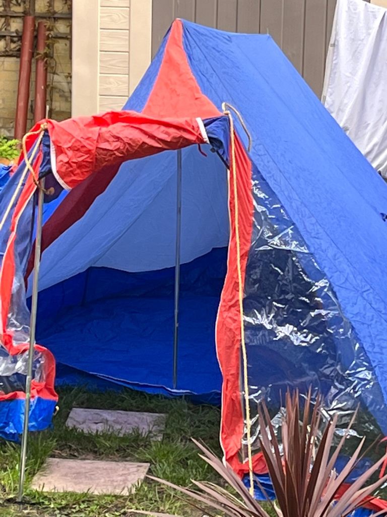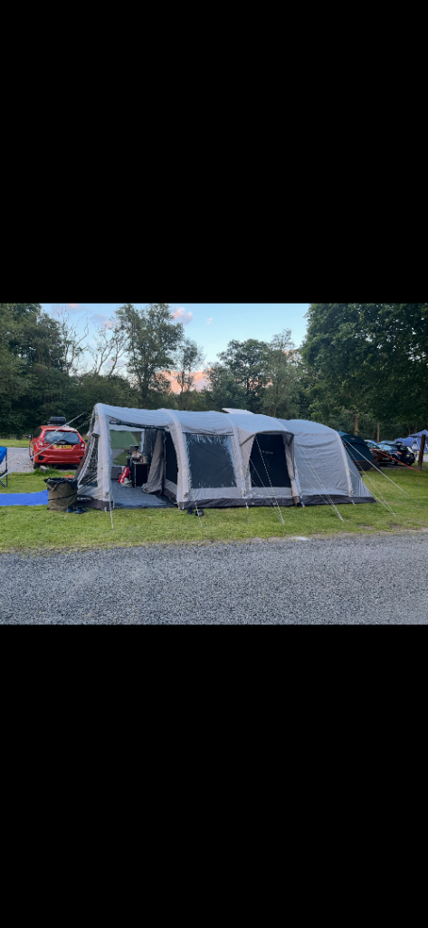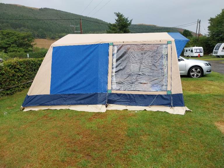 This has mesh inner walls all round to allow ventilation and stop bugs entering, an extended 1m deep canopy with frames which shades the entrance. It is robust and rain proof and gains strength from the arched overhang and webbing strap duo - these also prevent trip hazard amd redirect rain-pour away from the tent.