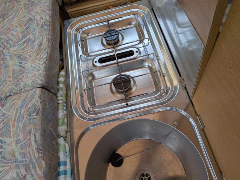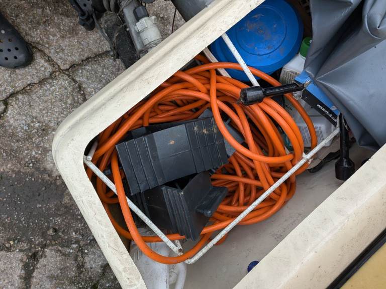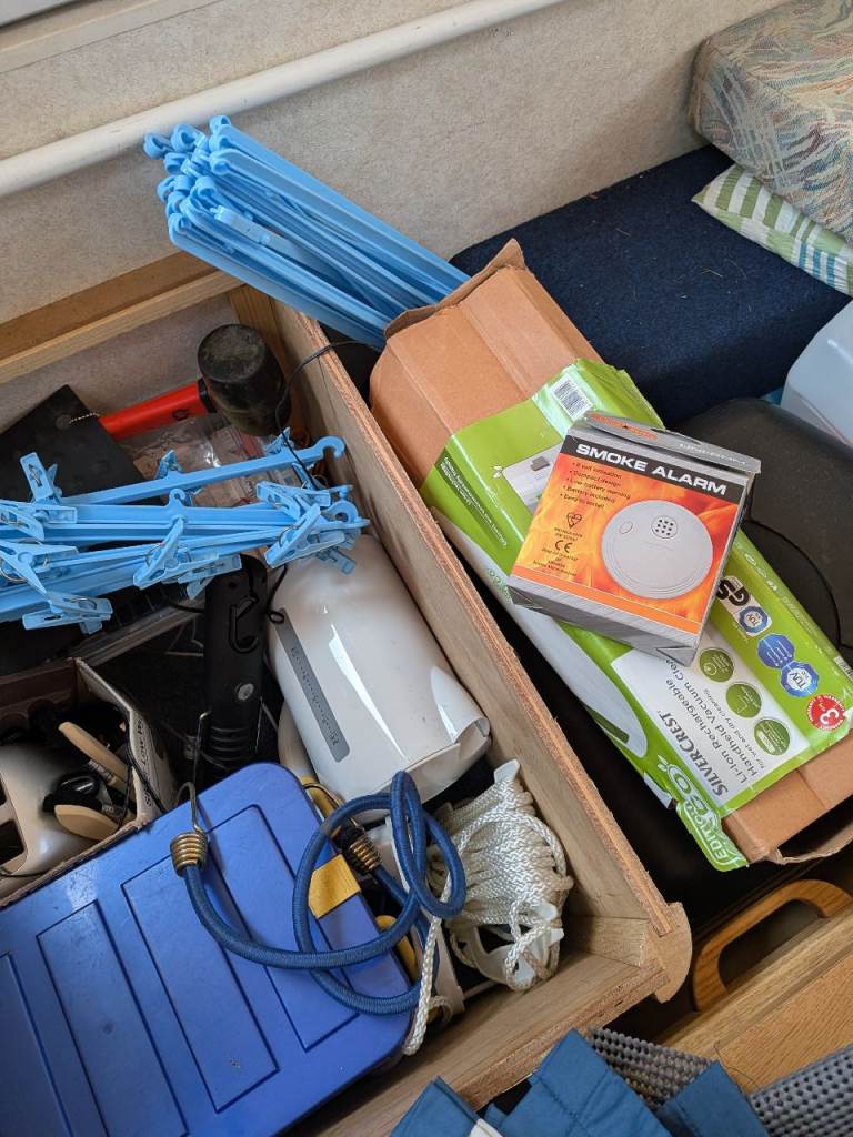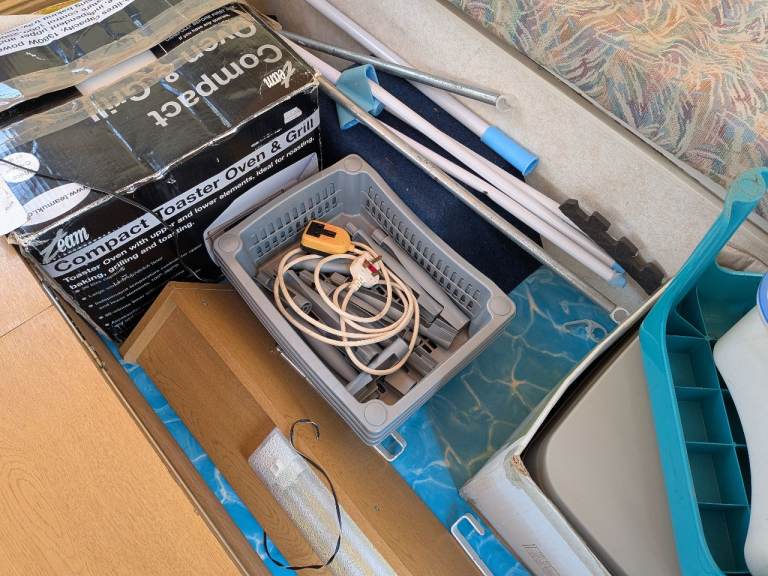 Various spares eg waste water piping, a few meters of blue rubber bungee, a gas bottle but no idea how much gas is in it.