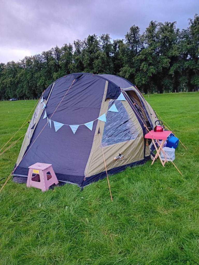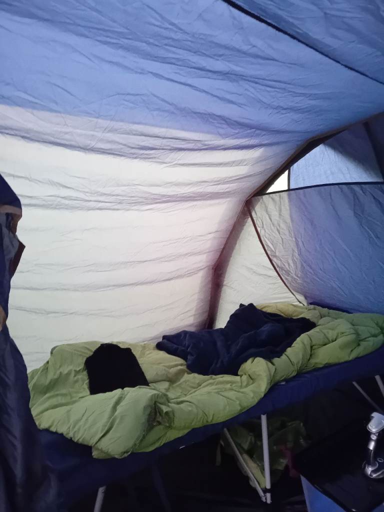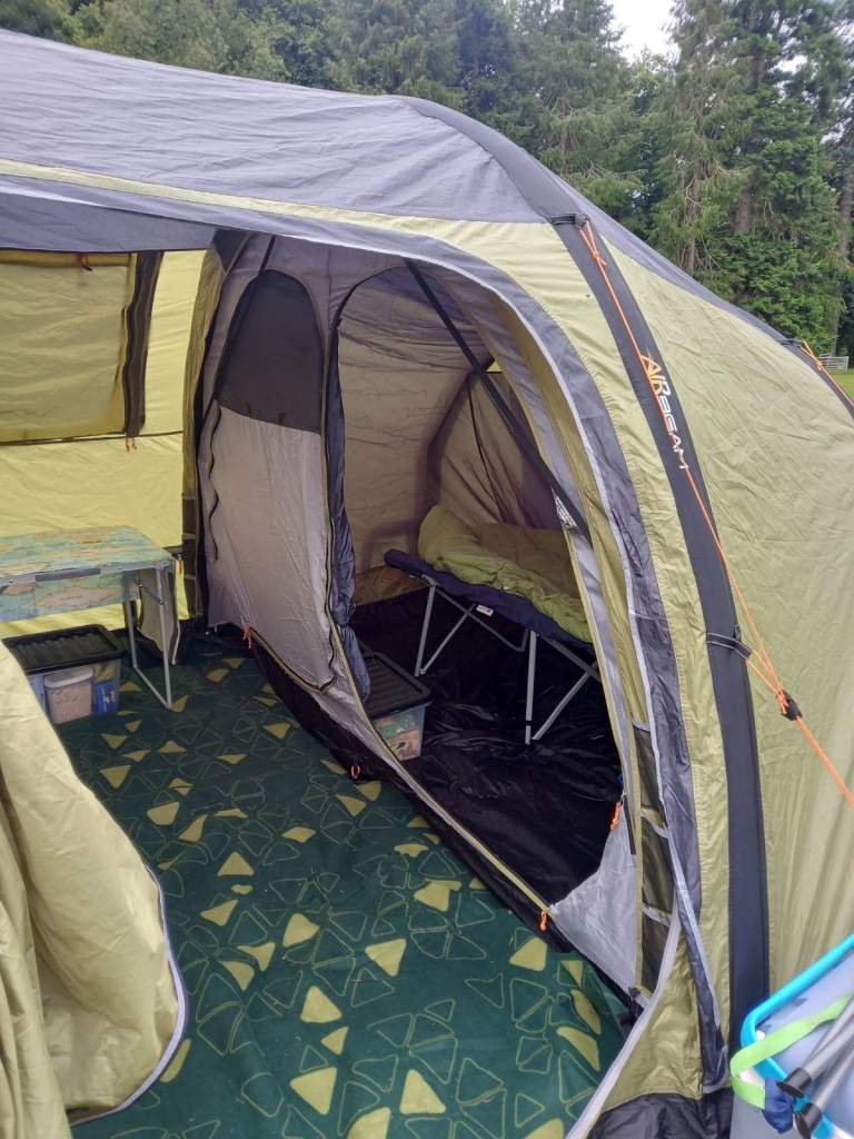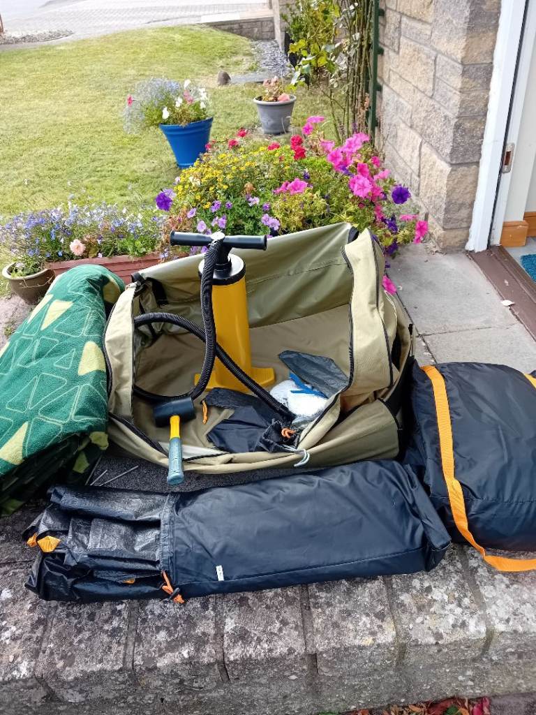 Air tent that is very easy to pitch by one person. It is called a 4 person tent and the inner bedroom would take 4 airbeds but I think it would be a bit tight. It is very comfortable and roomy for two or three. It comes with pump, mallet, footprint, carpet and a front canopy which has never been used. The only defect is in the storage bag where a divider has come unstitched and been mended with Gorilla tape. It has withstood Scottish storms without a leak. Also included is a 230v mobile mains power unit which has been used once. It has spent the winter spread out in my loft. Message me if you have any queries.