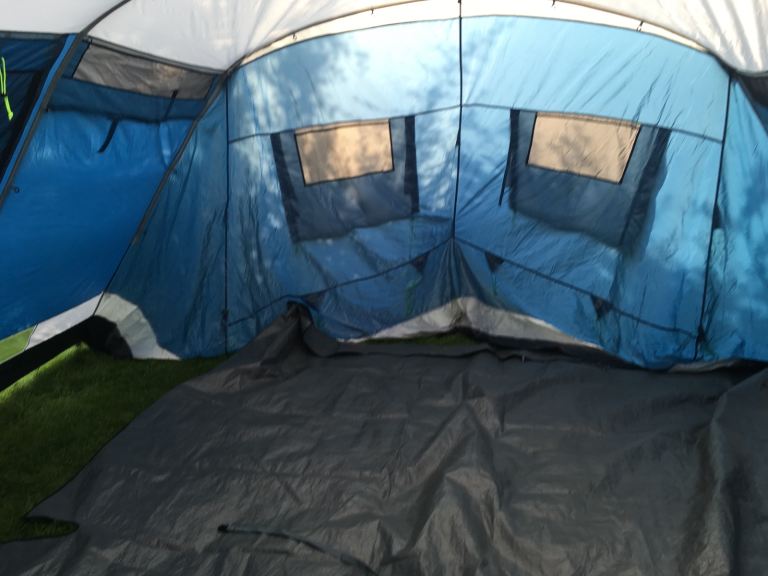 The following spec and description is taken from Grok - please be aware the the tent has a groundsheet which is separate to the tent except for the internal bedrooms which have a full unit groundsheet. The tent is heavy and two people can manage to set it up but would be easier with 3. Our tent has only been used 5 times so is clean etc. but there is a slight rip on the flange on one side which is about 6" long and doesn't affect the integrity of the tent at all. It is a very big tent and the 2 x bedrooms are big enough for 2 people each and yes you could sleep 6 if two people sleep in the main living area.