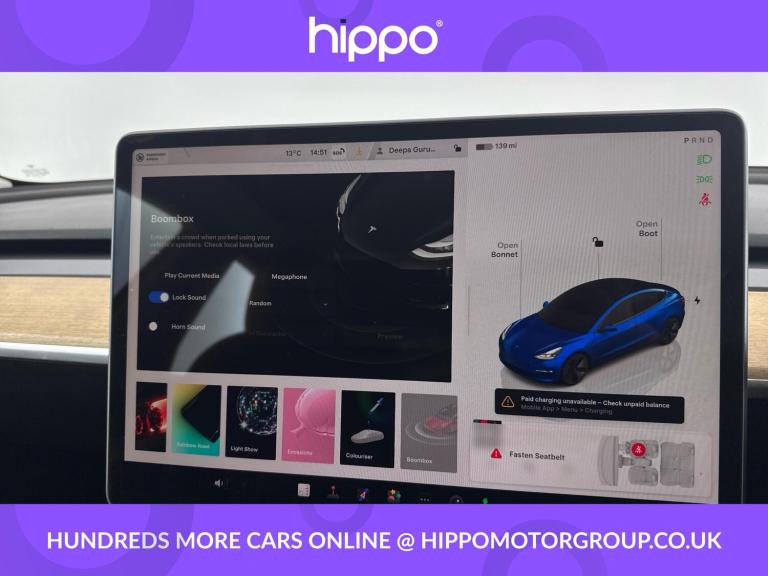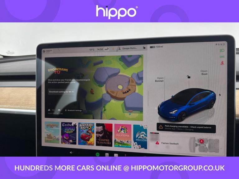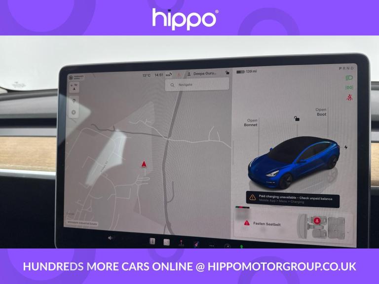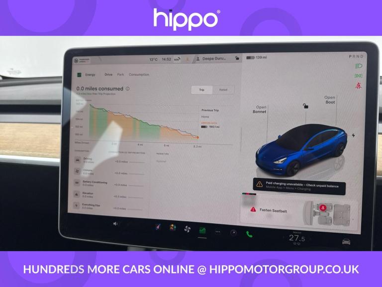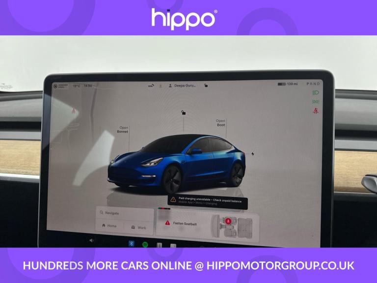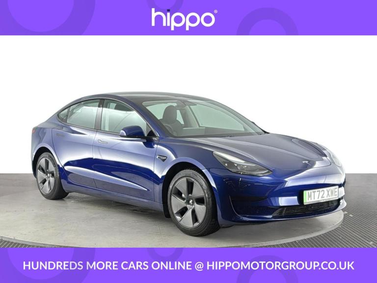 Presenting a Tesla Model 3 Saloon 4dr Electric Auto RWD, with 241 bhp and just 38,942 miles. This well-maintained electric saloon combines practicality and innovation, equipped with 18-inch Aero alloy wheels for enhanced efficiency and style. Inside, you’ll benefit from a comfortable cabin featuring 2-zone climate control, air conditioning, and heated front seats, ideal for all-season travel. The heated steering wheel and steering wheel-mounted controls further contribute to convenience and driving comfort. Stay connected with Bluetooth, a digital radio, and internet streaming via the OEM sound system. The integrated navigation system ensures seamless journeys, while the park assist camera aids in manoeuvring and parking with confidence. Enjoy the spacious atmosphere created by the fixed panoramic glass roof, featuring tinted glass with ultraviolet and infrared protection for added comfort and safety. Hippo Approved is known for a wide selection of vehicles suited for various needs and budgets. Each car undergoes a rigorous 130-point quality and safety inspection at our state-of-the-art £3 million preparation centre, ensuring your peace of mind. Additionally, we offer tailored finance packages for personal and business use, making it easy to acquire your ideal car.