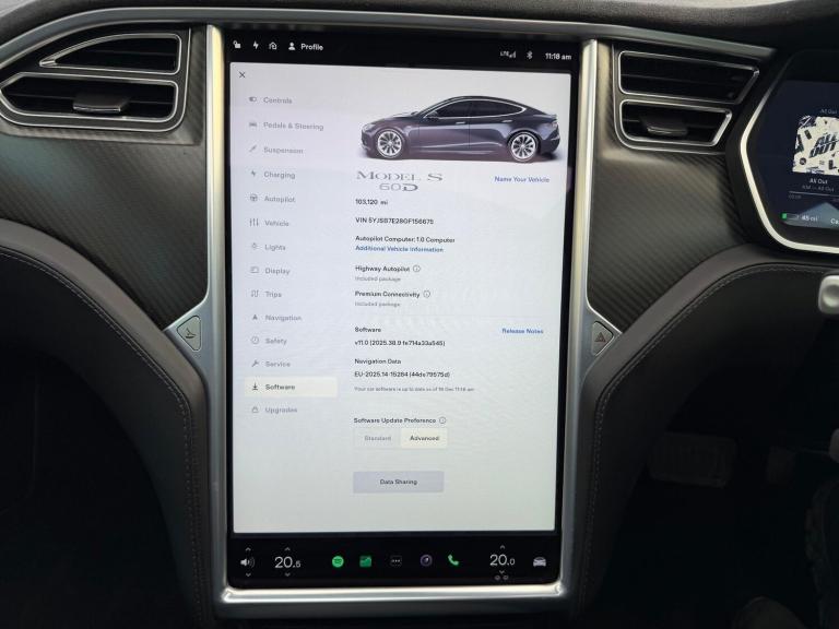 Free supercharge for life. Free unlimited supercharging. Enhanced Autopilot. Subzero weather package. Ultra high fidelity sound, with free Spotify. Premium upgrade package. Winter pack. Sunroof. CCS upgrade, MCU2 Screen upgrade £2k to do. This 2016 Tesla Model S 75D boasts an impressive provenance, having had only two owners since new. As an electric vehicle, it offers a smooth and quiet driving experience, powered by a 75 kWh battery. This four wheel drive model is equipped with a suite of advanced features, including Enhanced Autopilot with Adaptive Cruise Control, Blind Spot Warning, and Keyless Entry. Comfort is assured with Dual Zone Climate Control, and the vehicle sits on 19 inch Pirelli Winter Alloy Wheels.The Model S 75D stands out with its remarkable acceleration, achieving 0 to 60mph in just 5.2 seconds, demonstrating its performance capabilities. For convenience, a full charge at home using a 7kW charger takes approximately 12 hours, while rapid charging to 80% can be achieved in as little as 45 minutes at a public charging station. This vehicle also offers substantial practicality with its large boot space, making it an excellent choice for those seeking a blend of performance, technology, and everyday usability. Current range shows 225 miles on a full charge with real life performance attaining around 185 miles. Charge at any Tesla supercharger completely free! Recent new tyres and brakes, with a plethora of history at Tesla since brand new. Must be seen to be appreciated. This car also has smart air suspension! Whilst it has the 75D dual motor battery installed from factory it has the 60D software (can be upgraded at Tesla to 75D) however this is a testament to how lightly the battery has been used as it’s only ever used at around 80% capacity.