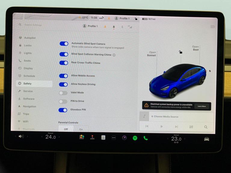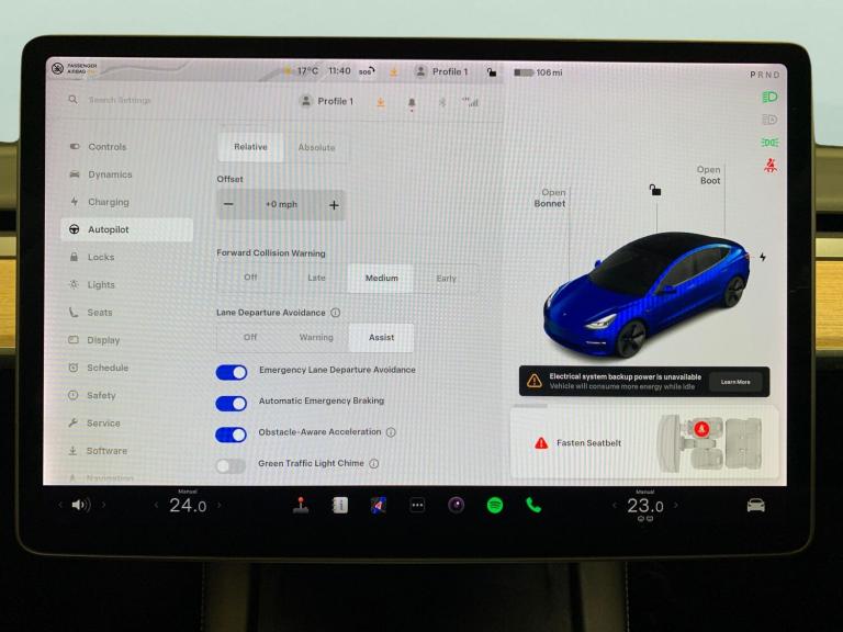 Experience the future of driving with this blue Tesla Model 3. Enjoy the open skies with a panoramic roof and sunroof, while heated seats and a heated steering wheel keep every journey comfortable. Stay confident on the road with Adaptive Cruise Control, Active Lane Assist, Blind Spot Assist and Park Assist. Keyless entry and a reversing camera add convenience, and LED headlights light the way ahead. Navigate with ease thanks to built-in Sat Nav and wifi connectivity. 2 services recorded, last serviced on 02/10/2025 at 24,732 miles. MOT to 02/10/2026. Visit our website for service history, online valuation, full vehicle specification plus multiple images. Any feature/option specified here is from 3rd party data. We cannot guarantee the accuracy of any specification supplied by a 3rd party. We recommend that you physically check the specification of the vehicle on site prior to purchase. This information does not form part of the buying contract. Terms & Conditions apply. We have over 2,000 cars available from our 10 national branches, check our website to see all our stock. Our Trustpilot rating is 4.4/5 with over 9,000 reviews.