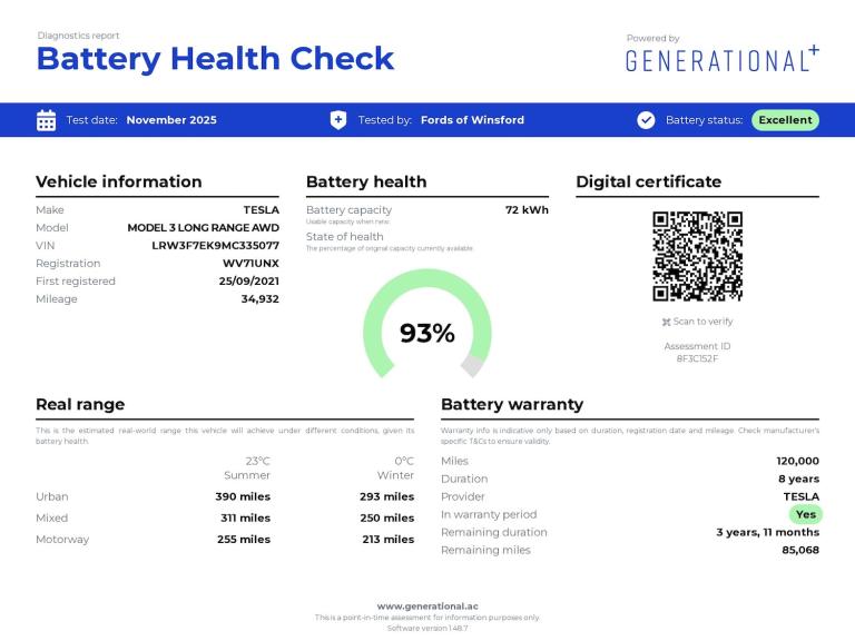 This 2021 Tesla Model 3 Long Range presents an exceptional ownership opportunity with only one previous owner and remarkably low mileage for its age, standing at just 34,929 miles. This electric vehicle boasts a substantial 78 kWh battery, offering a maximum range of 360 miles when new, and features a responsive Four Wheel Drive drivetrain. For your peace of mind, the MOT is valid until October 2026. Inside, youll find convenient features such as LED headlights, 2 zone climate control, and both front and rear parking sensors to aid manoeuvrability. Adaptive cruise control is also included, enhancing your driving experience on longer journeys. Experience impressive performance with the Tesla Model 3 Long Range, capable of accelerating from 0 to 60 mph in a swift 4.2 seconds, a highlight that sets it apart from many other vehicles. This model also offers a generous boot space, providing ample room for your luggage or shopping. Recharging is straightforward, with a full charge at home taking approximately 12 hours using a 7kW charger, while rapid public charging can take you from empty to 80% in as little as 26 minutes, making longer trips more manageable. Welcome to the award winning FOW Car Supermarket. Were the largest and most trusted Car Supermarket in the North West with two convenient locations in Winsford, Cheshire and Trafford, Manchester. With over 60 years of experience, were proud to offer award winning customer service and great prices alongside one of the UKs...