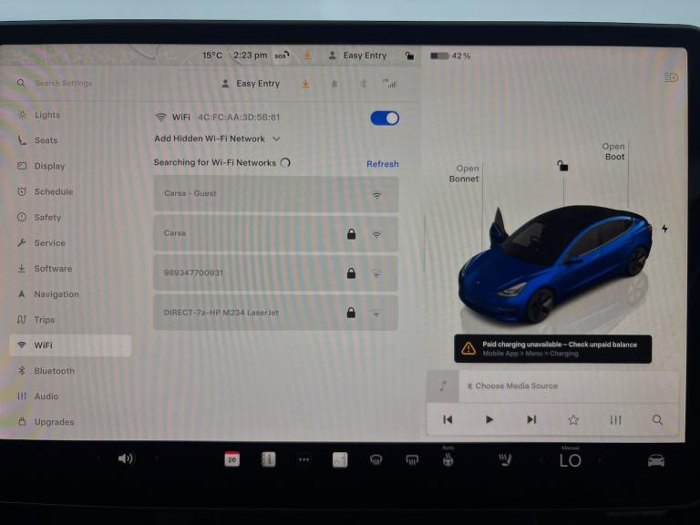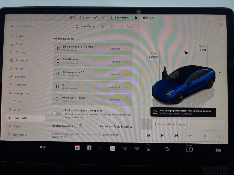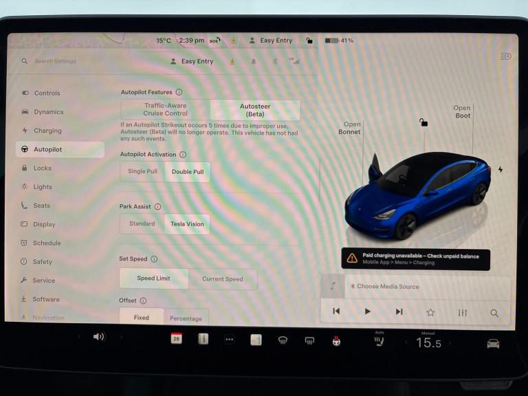 Experience the Tesla Model 3 in striking blue, boasting a luxurious panoramic roof and plush leather seats with heating for supreme comfort. Stay safe and stress-free with adaptive cruise control, active lane assist, park assist, and blind spot assist. Enjoy seamless access with keyless entry, a heated steering wheel, and integrated garage door control. Navigate easily with built-in sat nav, stay connected via WiFi, and drive confidently with LED headlights and a reversing camera. Discover electric performance with premium features. 1 service recorded, last serviced on 26/02/2026 at 42,182 miles. MOT to 14/02/2027. Visit our website for service history, online valuation, full vehicle specification plus multiple images. This vehicle is VAT qualifying. Any feature/option specified here is from 3rd party data. We cannot guarantee the accuracy of any specification supplied by a 3rd party. We recommend that you physically check the specification of the vehicle on site prior to purchase. This information does not form part of the buying contract. Terms & Conditions apply. We have over 2,000 cars available from our 10 national branches, check our website to see all our stock. Our Trustpilot rating is 4.4/5 with over 9,000 reviews.