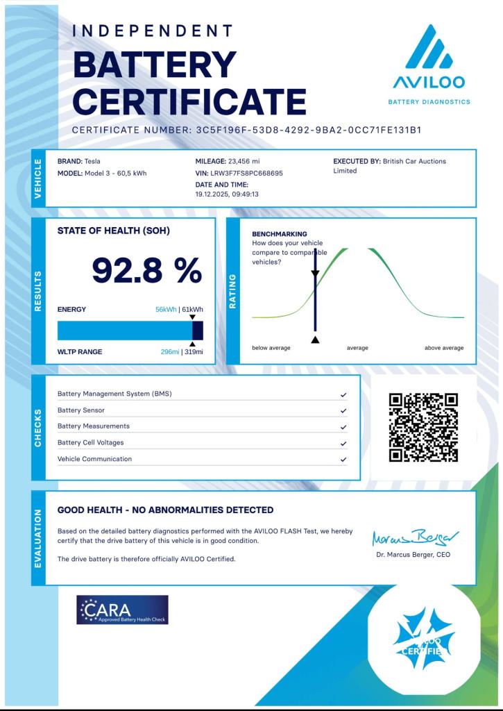 Finished in a stunning White exterior, this Tesla Model 3 exudes sophistication and style. But it's not just about looks - with 241 bhp under the hood, this electric car delivers an exhilarating driving experience that is both eco-friendly and high-performing. Don't miss your chance to own this exceptional Tesla Model 3. Contact us today to schedule a test drive and experience the future of driving for yourself.For peace of mind this vehicle has completed a multi point AA inspection.Competitive finance is also available.We are open 7 days a week and have more than 1500 cars to choose from.All our Euro 4 Petrol and Euro 6 Diesel vehicles meet the ULEZ standard.Vehicle specification can be found below. From time to time vehicles have manufacturer recalls notified. Please read our recall policy on our website for further information. Please be advised that the advertised electric vehicle (EV) listings may experience battery degradation over time, resulting in reduced performance and range compared to the original specifications. Factors such as usage patterns, environmental conditions, and charging practices can contribute to this degradation. While we strive to provide accurate information, the actual battery health and performance of each EV may vary. Customers are encouraged to conduct thorough research and consider the potential impact of battery degradation before making a purchase decision. We recommend consulting with a qualified technician or conducting a battery health inspection for further assessment.Disclaimer: While every effort is made to ensure the accuracy of vehicle specifications, features, and descriptions, errors and omissions may occur. Specifications and equipment may vary and may not be present on the vehicle at the point of sale. Buyers are advised to confirm all details with the seller before completing a purchase.