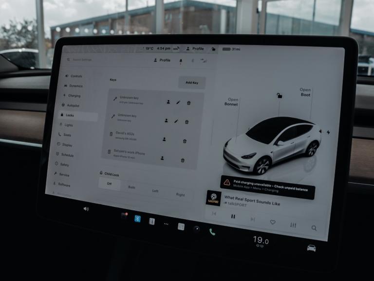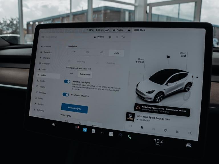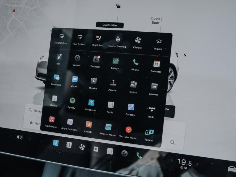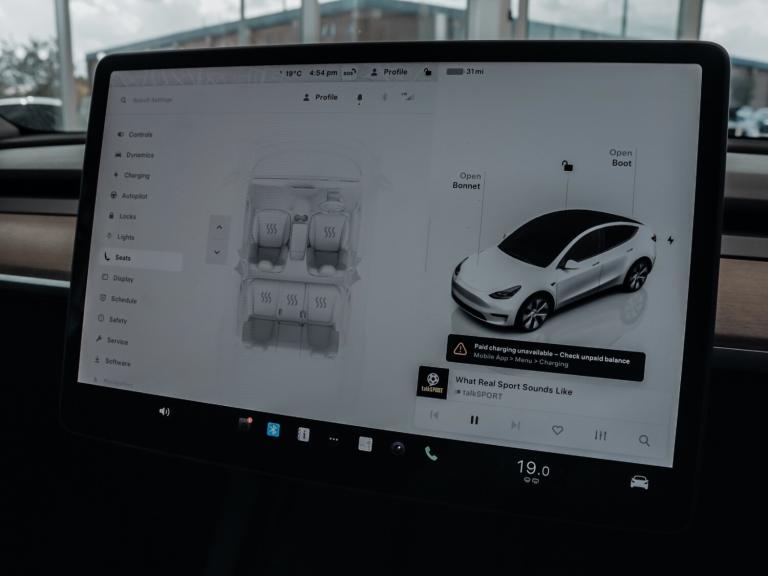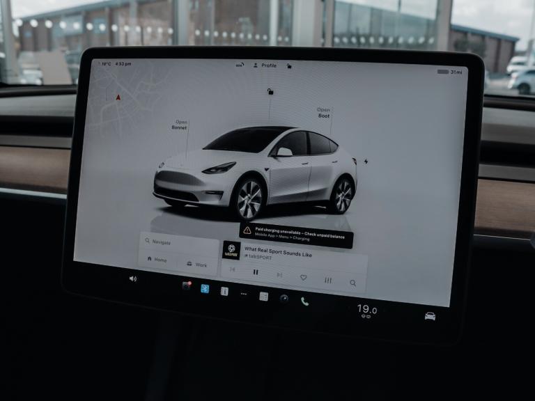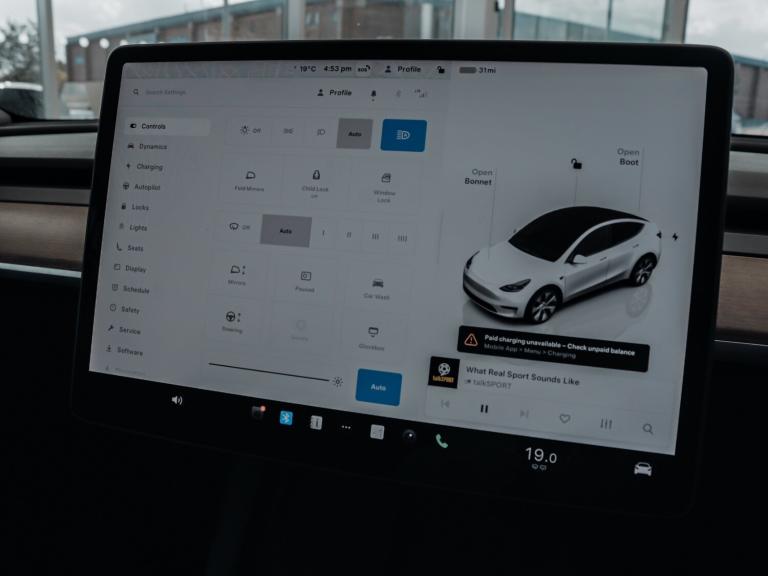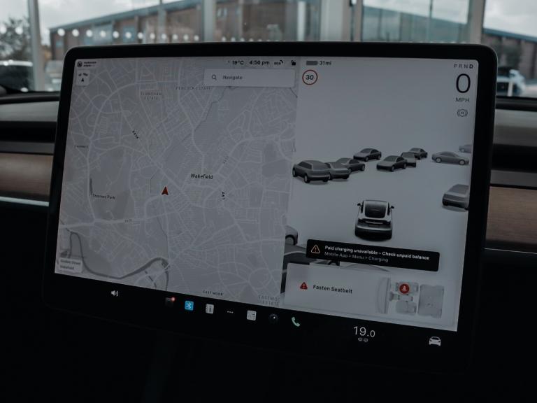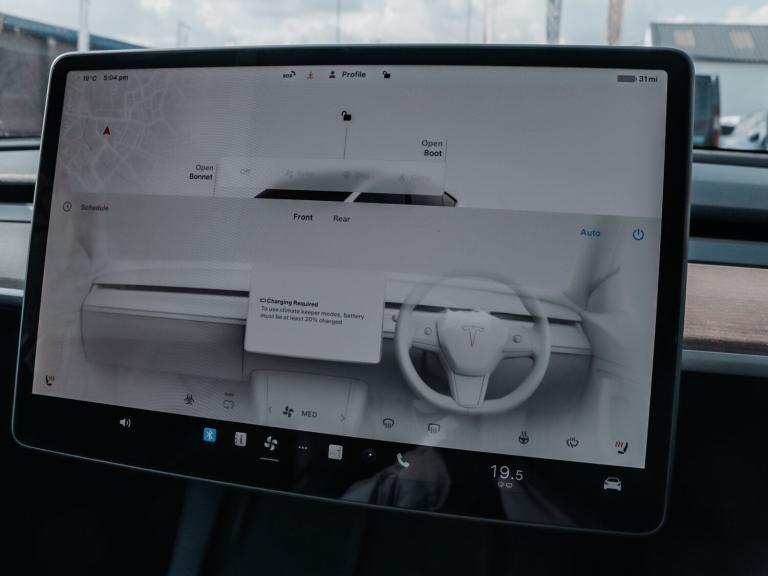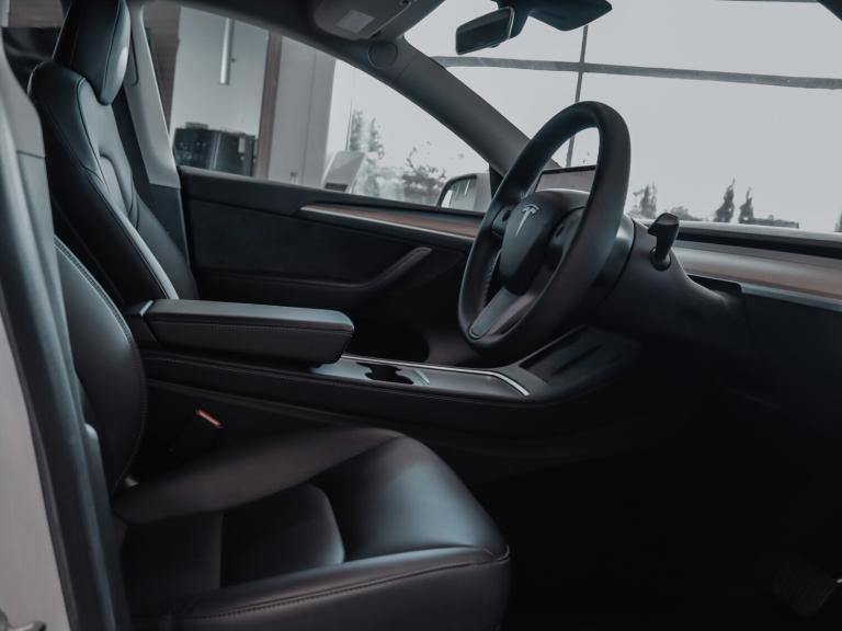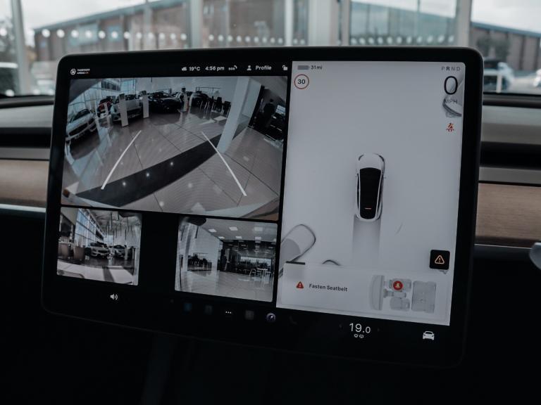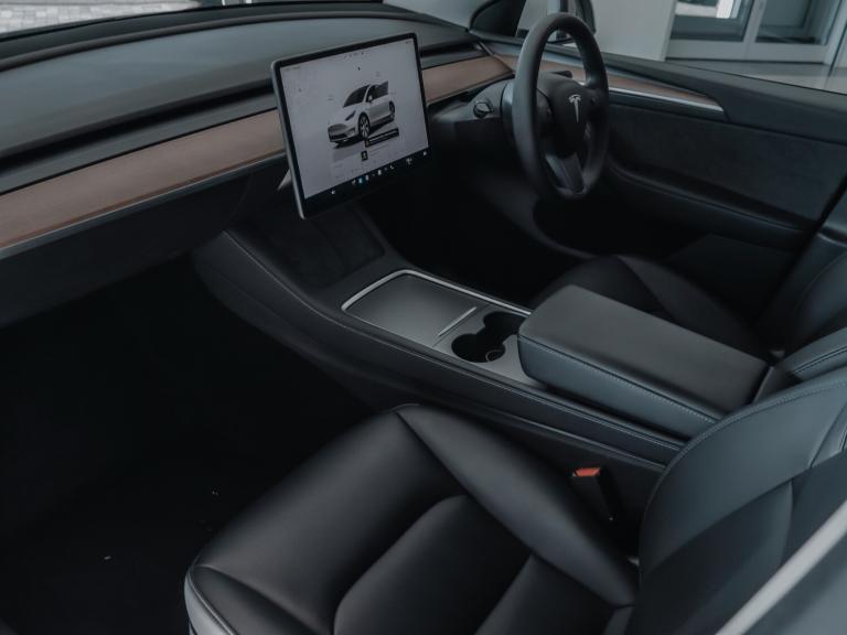 ..15'' Touchscreen display, Acoustic seat-belt warning, Blind spot monitoring, Bluetooth hands free phone with voice control system, Custom driver profiles, Electric assisted front and rear doors, Emergency call service, Front and rear parking sensors, Homelink (programmable garage door opener), Mobile App interface, Navigation system, Power lift tailgate, Reversing camera, Service indicator, Software updates over WiFi, Speed limit recognition, Speed sensitive power steering, 11 kW AC onboard charger, CCS charging connector, Dual motor AWD wheel drive, Tesla mobile connector + domestic adapter (British 3-pin), Type 2 connector, 4 USB C ports, DAB Digital radio, Music and media via bluetooth, Premium audio 14 speakers, 1 subwoofer, 2 amps and full immersive sound, 3rd brake light, Auto high beam, Automatic headlights and wipers, Daytime running lights, Electric windows with one touch open, LED fog lights, LED Headlights, LED tail lights, Power folding, auto dimming and heated wing mirrors, Rain sensitive windscreen wipers, Rear side wing doors, Rear view mirror auto dimming, Rear window defroster, 12 way Power adjustable driver seat with lumbar support, 2 fixed rear headrests, 3 seat bench in 2nd row, Auto dual-zone climate control system, Center console with storage, 2 cup holders and armrest, Driver and front passenger sunvisors with illuminated vanity mirrors, Electronic fold flat seat release 40/20/40, Expansive glass roof with ultraviolet and infrared protection, Front head restraints, Glovebox, lockable with illumination, Heated front seats, Heated rear seats, Heated steering wheel, HEPA filtration system - ''Bioweapon defence mode'', Interior ambient lighting, Interior floor mats, Map and reading lights, Power adjustable steering wheel, Rear centre armrest with 2 cup holders, Single front passenger seat, Type 2 cable, 3 point front seatbelts with pre-tensioners, 3x3 point rear seatbelts, ABS + traction control, Active safety technologies including collision avoidance and automatic emergency braking, Collision warning, Driver/Front Passenger airbags, EBD + Brake Assist, Electronic parking brake, Electronic stability control, Emergency braking, Rear door child safety locks, Side curtain airbags, Tyre pressure monitoring system, Anti theft alarm, Dashcam, Keyless driving and keyless entry, Wireless phone charging, Premium open pore wood decor