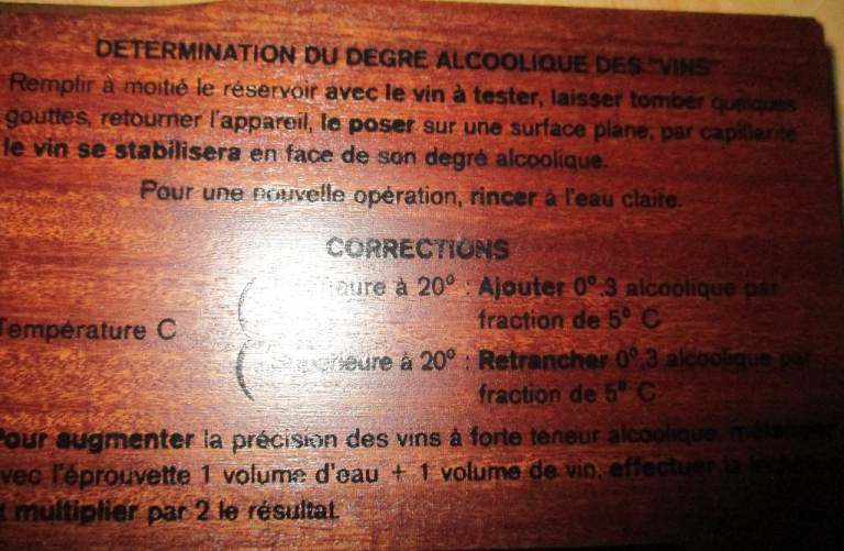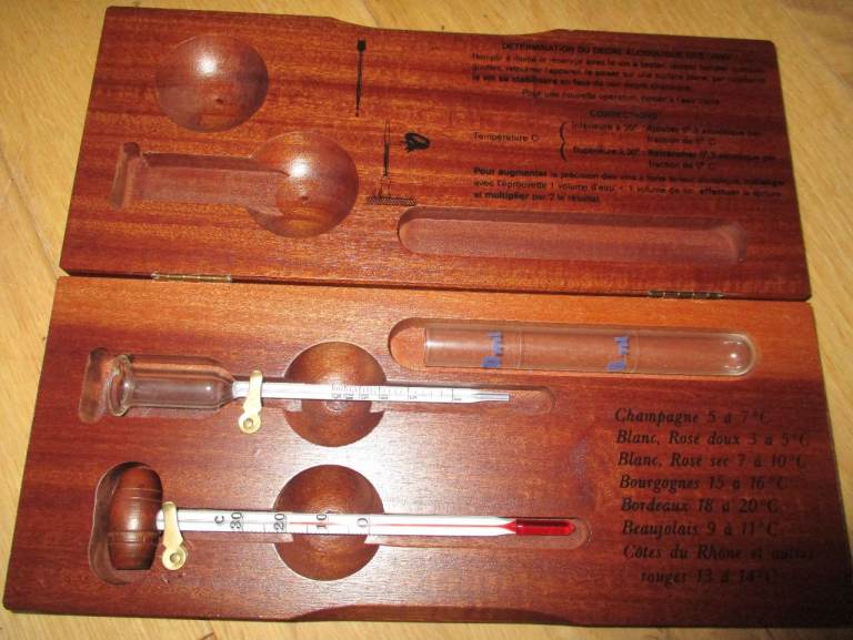 Vintage French wine thermometer and alcohol volume test kit - "Pour Servir a La Juste Temperature".