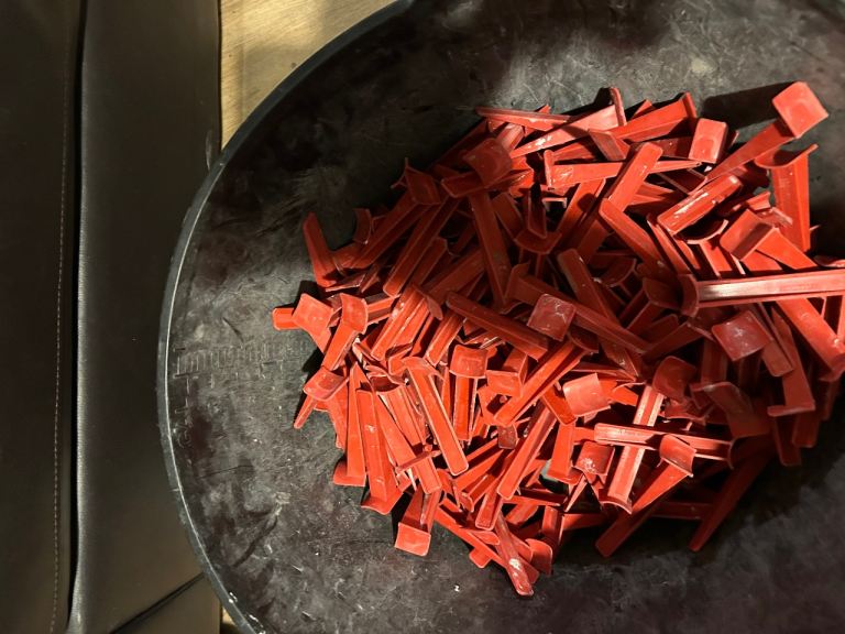 Almost full flexi tub N.3 full of Dakota tile levelling system red inserts