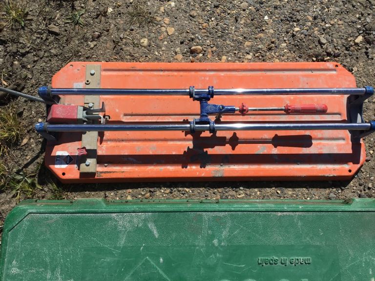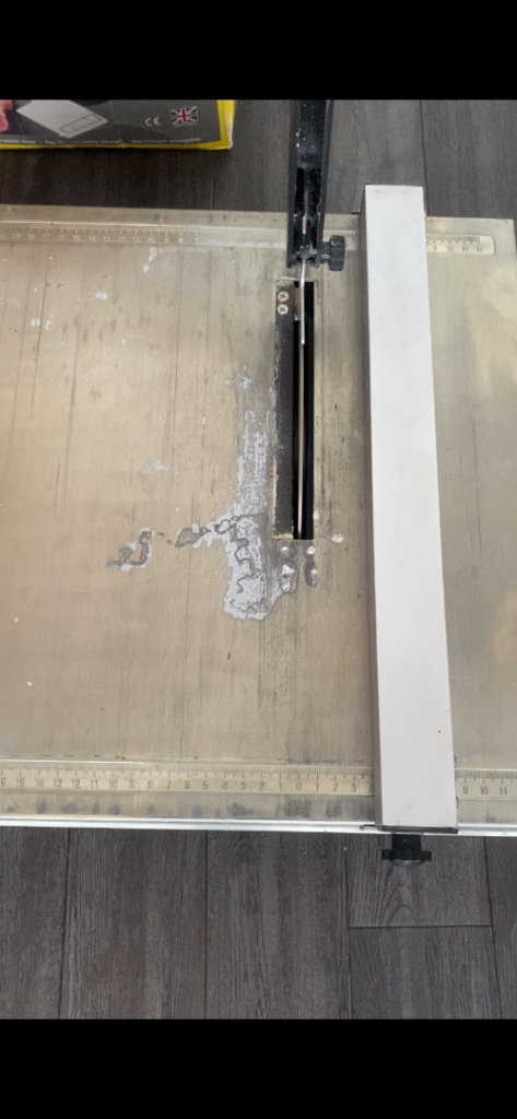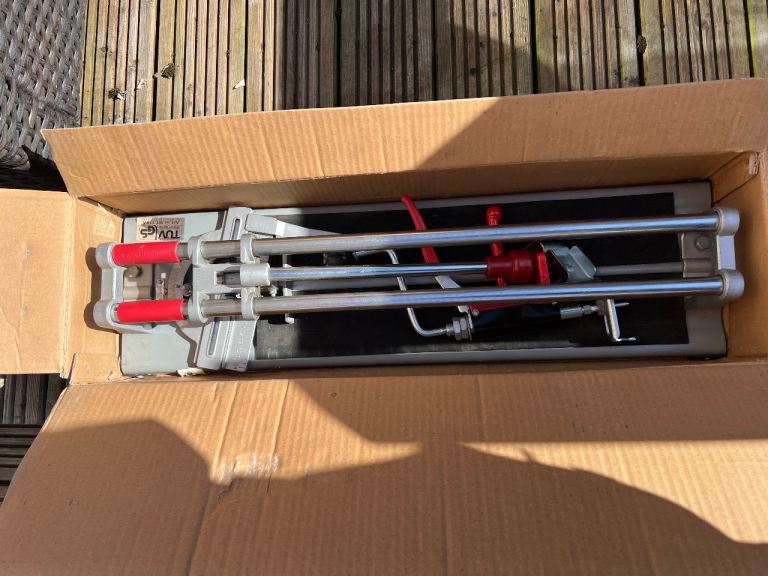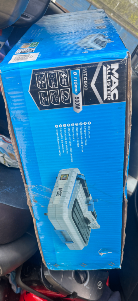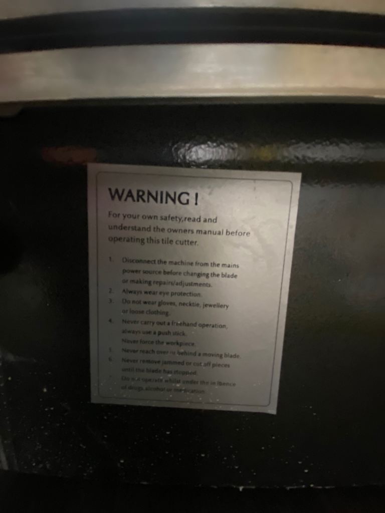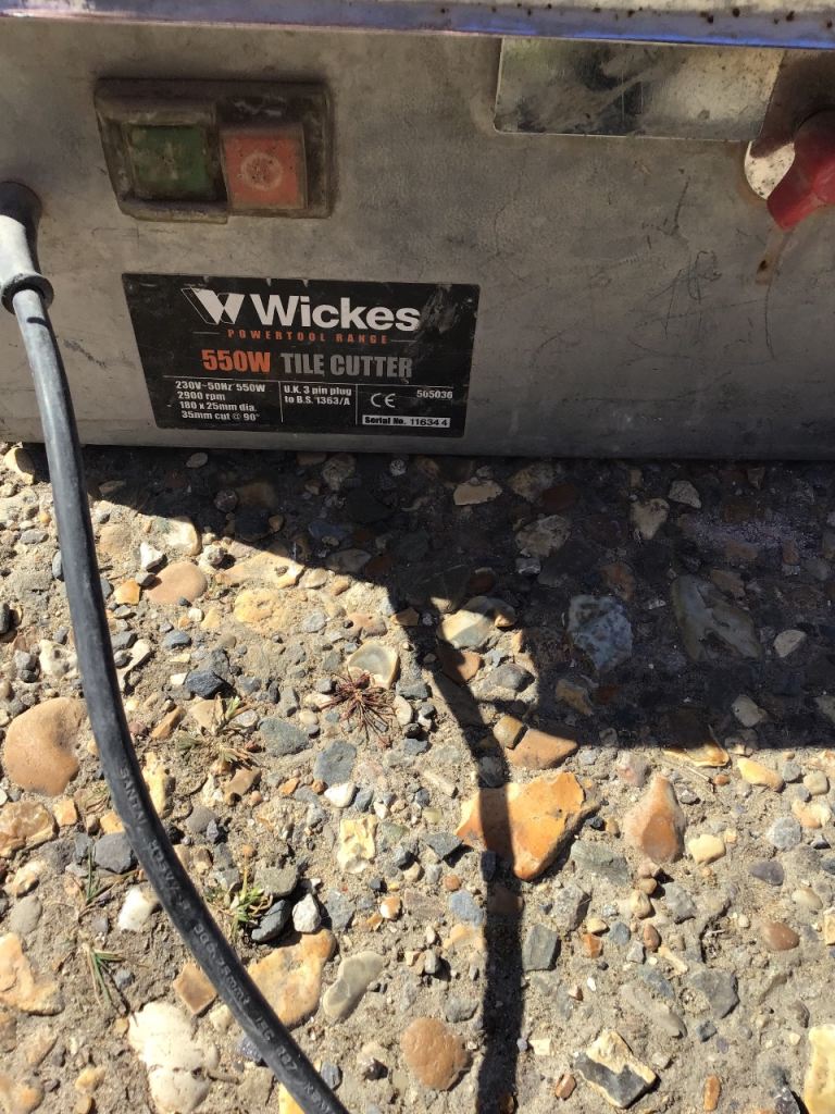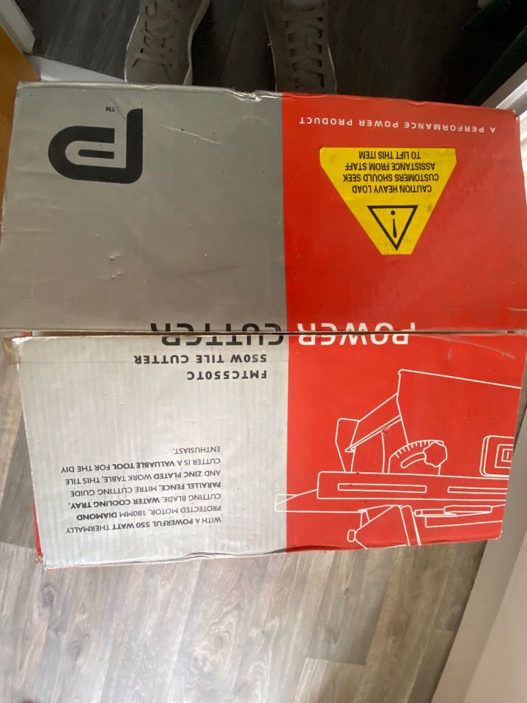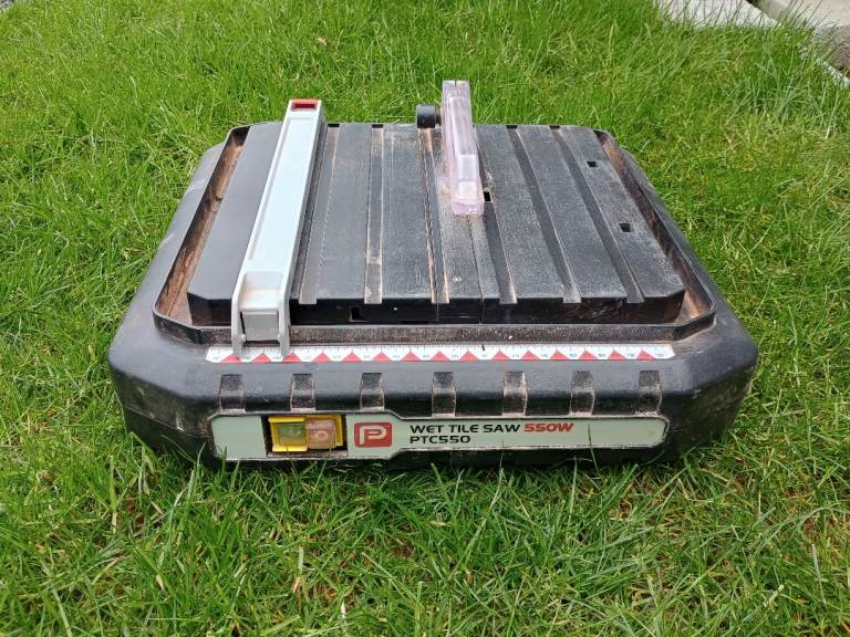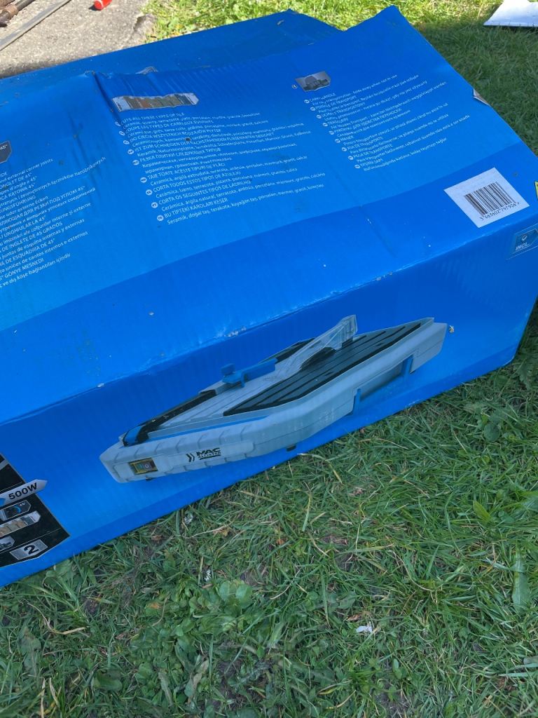 550w electric tile cutter with diamond blade in used good condition boxed had a water tray for keeping the dust down measured sides for accuracy and a safety guard.