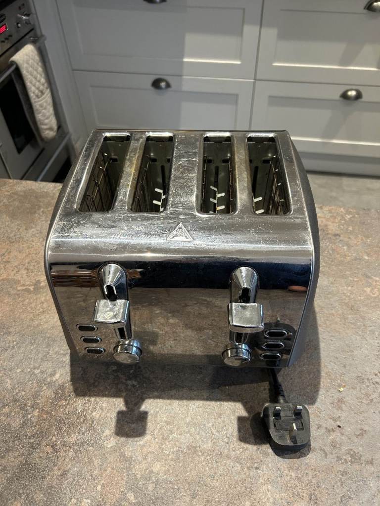 It is equipped with removable crumb trays for easy cleaning.