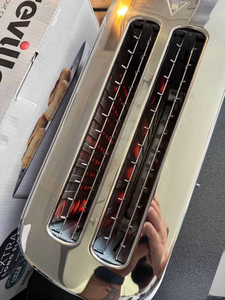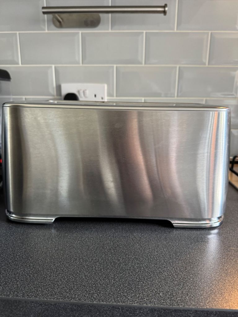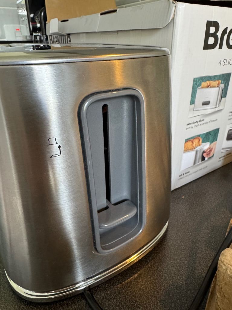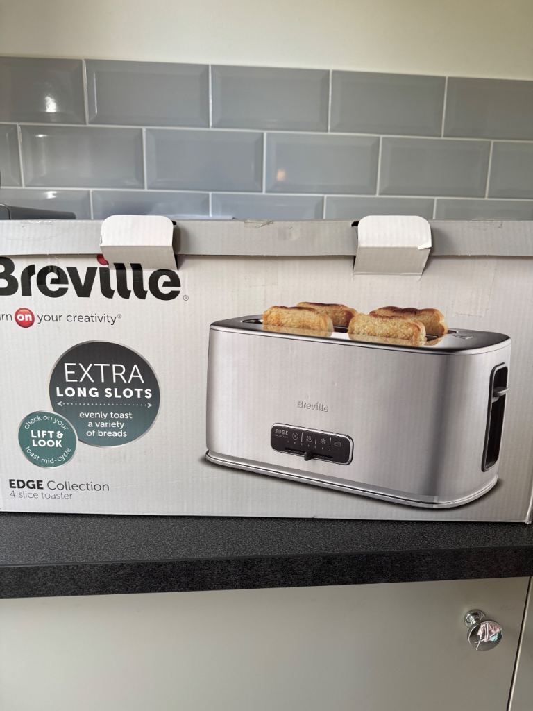 Brand new Breville Edge Collection 4-slice toaster, still in its original box and never used. Stylish stainless steel design with extra-long slots perfect for a variety of breads, bagels, and crumpet