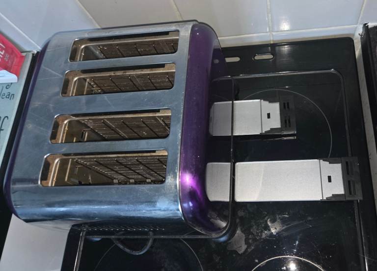 4 toasts at the same time, great for a family or a very hungry person! Two trays at the back, haven't used it for a while hence selling.