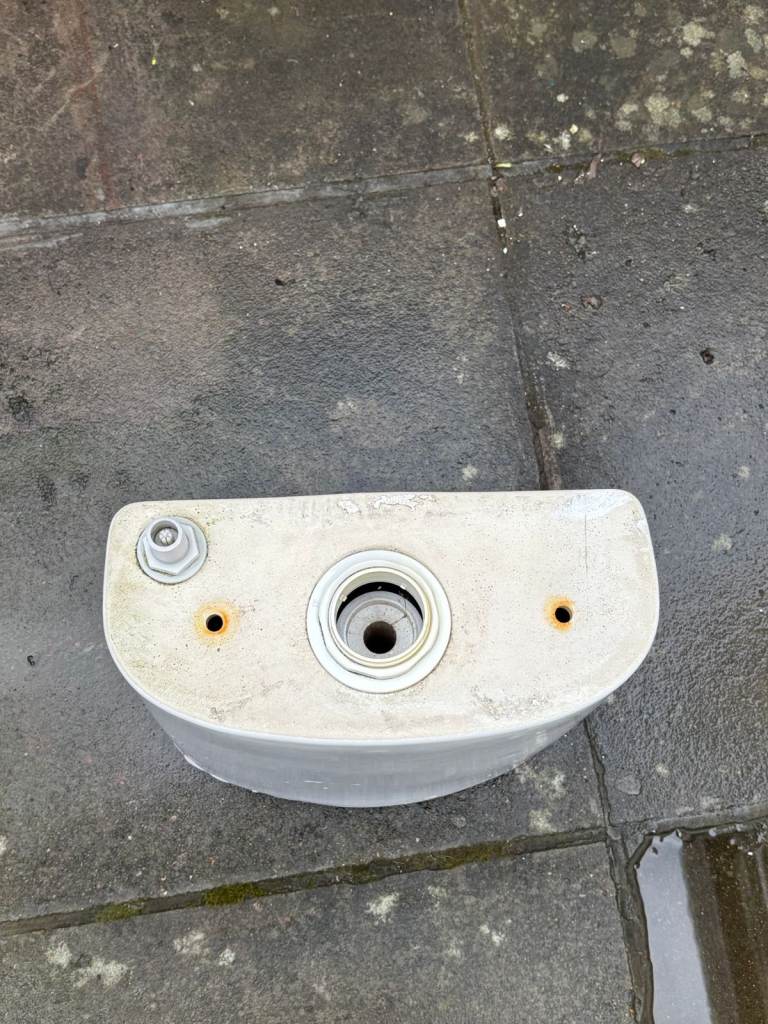Condition: Solid ceramic with no cracks or major damage. Has been stored outside, so expect some surface dirt, weathering marks, light rust stains around holes, and general wear. Cleans up reasonably well. No internal flush mechanism (syphon/float) included.