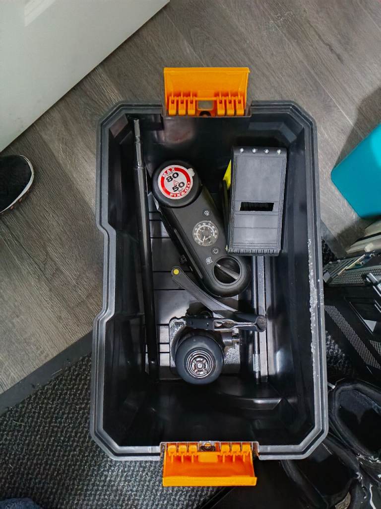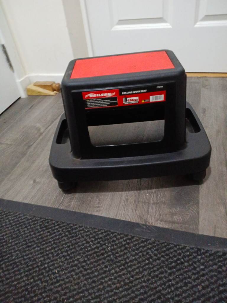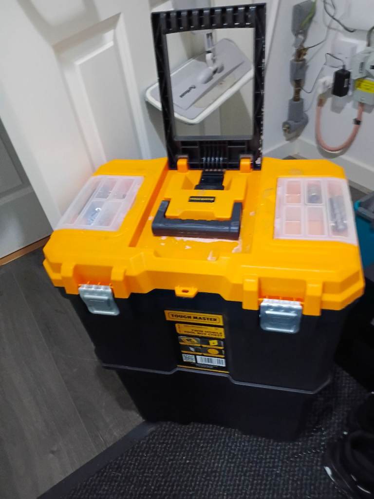 2 part large toolbox on wheels + mechanics roller stool + tools, fast tyre inflater and 7 tonne bottle jack and tyre chocks.