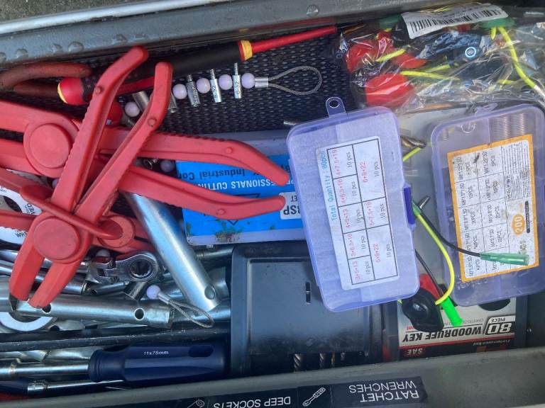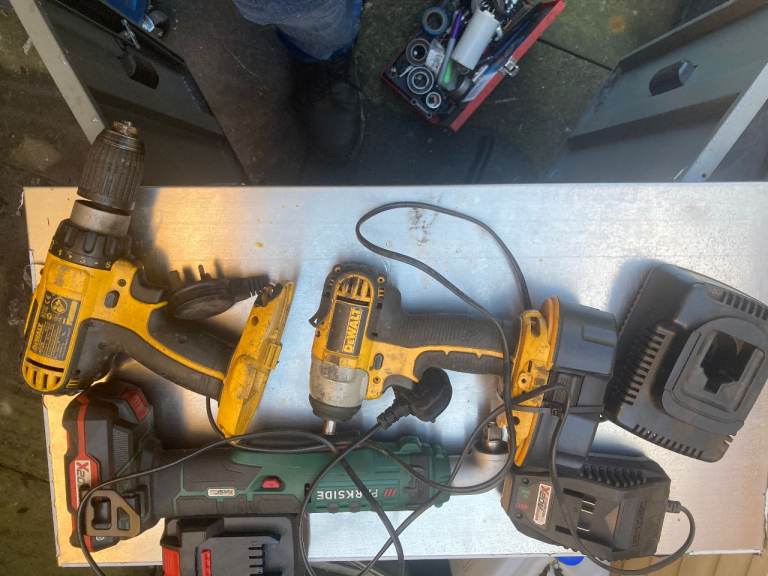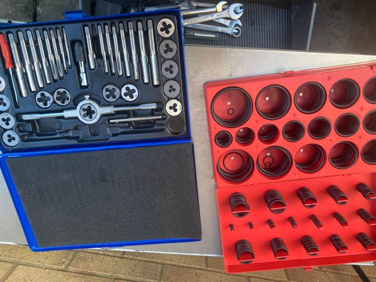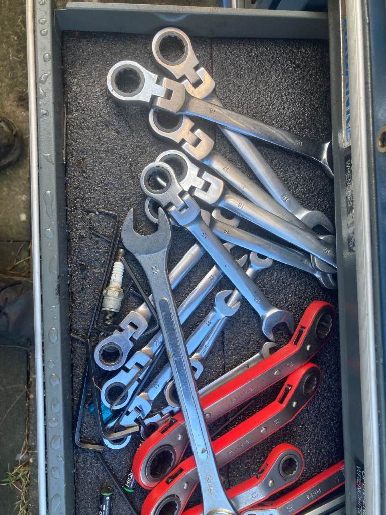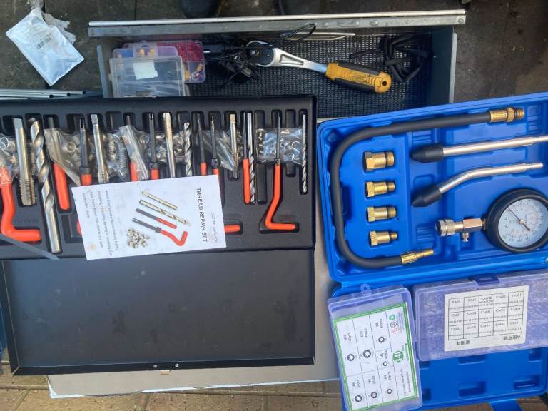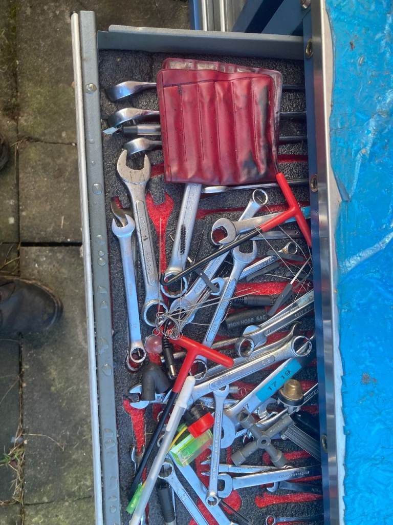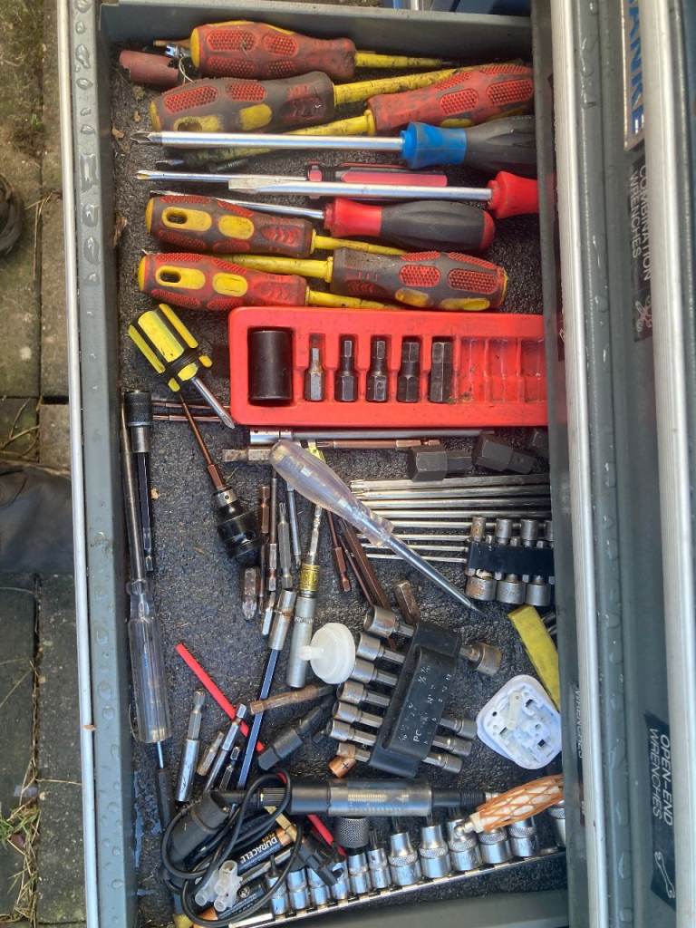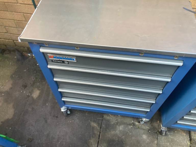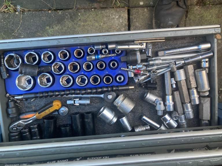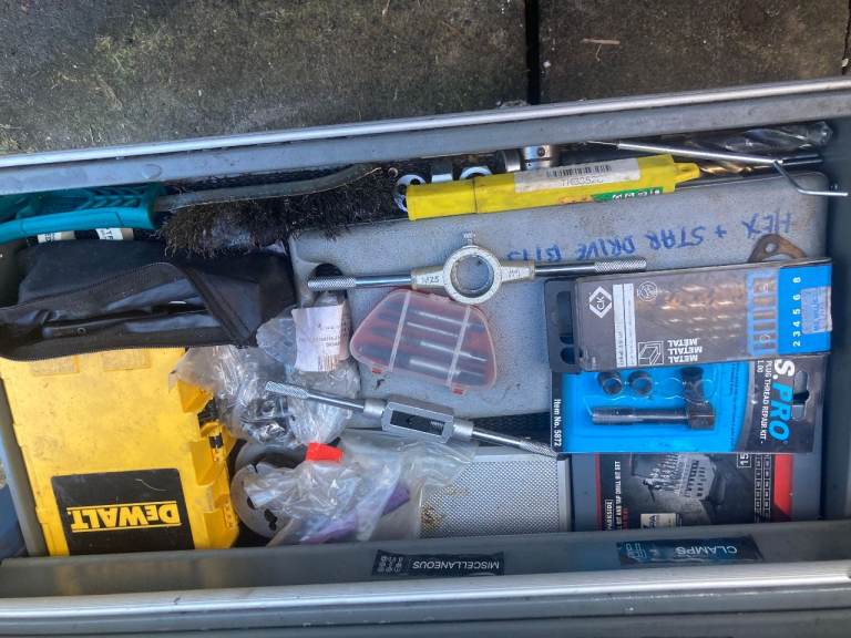 3 tool cabinets, 1 has 7 draws, 1 has 5 draws, 3rd has 1 shelf. All the tools are included in the sale including the Dewalt drill and impact wrench and parkside 90º impact wrench, all working, and with chargers, although the batteries for the Dewalts could do with being replaced. Rachet spanners from 8mm to 20mm and normal metric spanners 8mm - 20mm + some imperial. Socket set from 8mm to 30mm and various impact sockets and other sizes. Various screwdrivers, nut drivers, torque drivers, hex drivers. Various hammers pliers, cutters and other bits and peices. Tap and dies both metric and imperial, bolt extractors, nut extractors, Dewalt drill bits, small carb tuning bits. Helicoil inserts (lots of different sizes) cylinder test (psi) kit, O ring kit, full set metric and imperial allen keys. I have 2 new locks for the single shelf and 5 draw cabinets, as I lost the keys, just need fitting. The cabinets currently are on castors but also have a full set of stands, each cabinet can be attached to each other via a simple catch locking them together. There are far too many tools to list, and I will add some more as I clean out my shed. AS these are heavy you will need to arrange a van with 2 men to lift them. I will not post them. Collection is from Telford Shropshire. These are avertised elsewhere so I reserve the right to end the bidding early.
