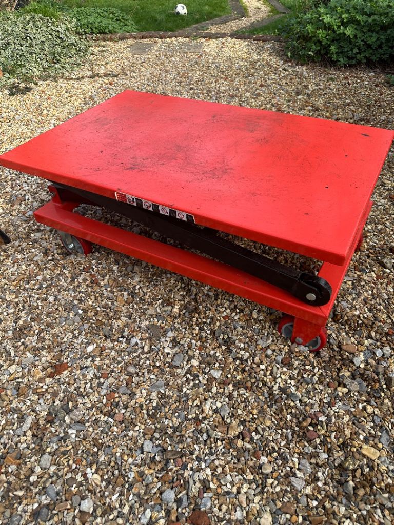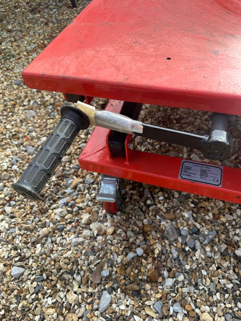 Been using as a mower repair cart. Manual wind lift from 40cm to 100cm.