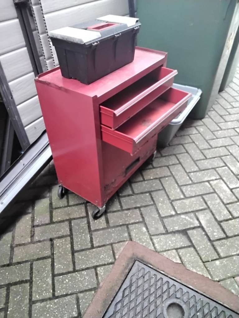 Red 2 draw and underneath storage tool box, as you can see from the picture it is a bit dented and rusty but has a lot of life left in it.