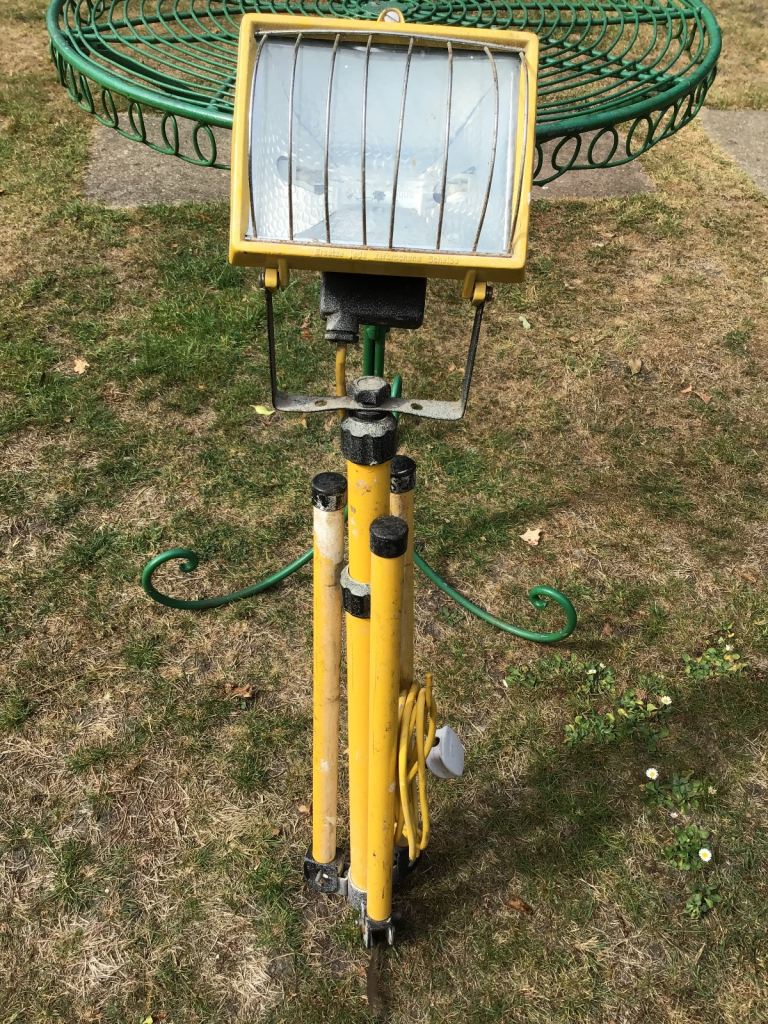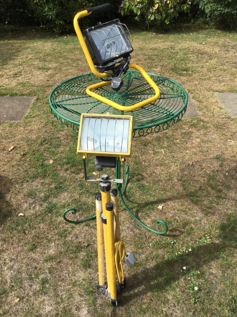 Two portable mains powered halogen work lamps. One single extending tripod type and second as shown in photo. Both in used condition but in working order. Cash on collection.