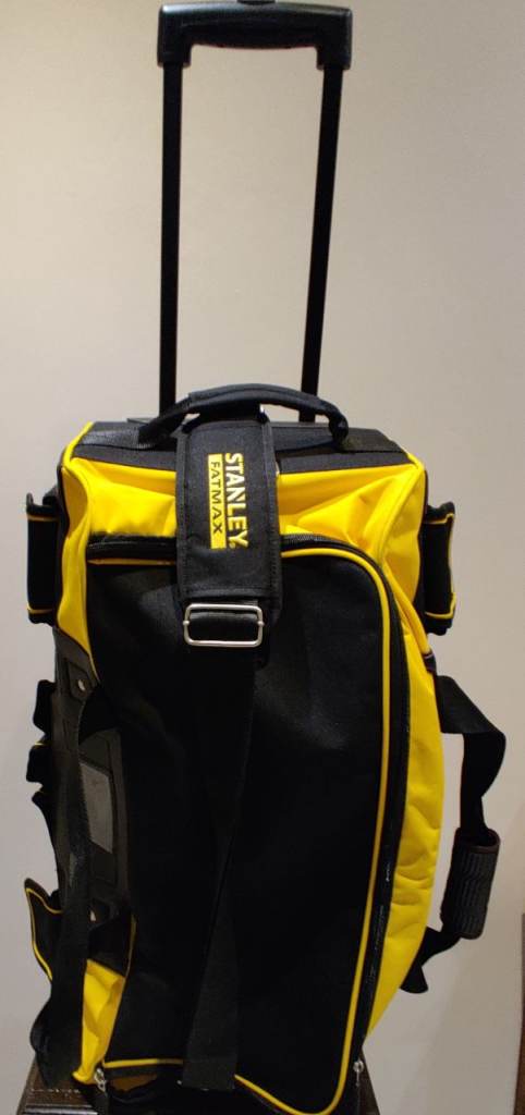 Stanley fatmax rolling wheeled bag. Fits a wide range of tools including 60cm levels, saws and tapes. An internal partition helps keep your tools organised. Large opening for easy access to content. Made from durable 600 denier fabric with a rivet construction and waterproof base for increased wear resistance. Fitted with an easy carry handle and shoulder strap as well as a telescopic handle and 2 wheels for easy transport of heavy loads.