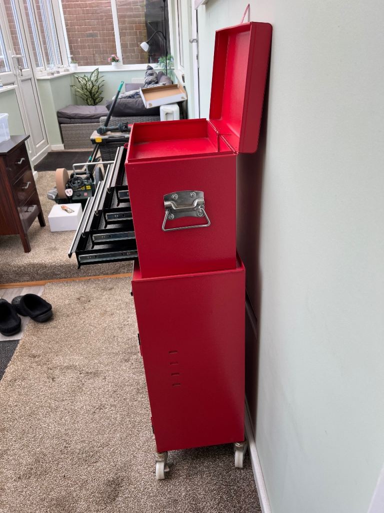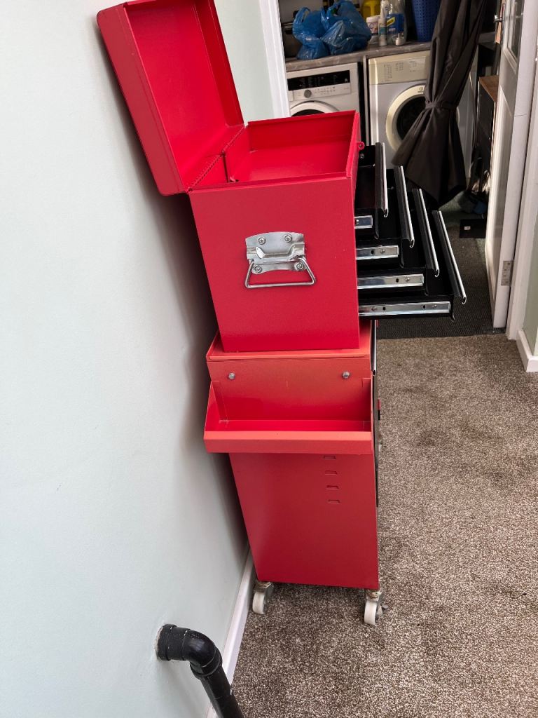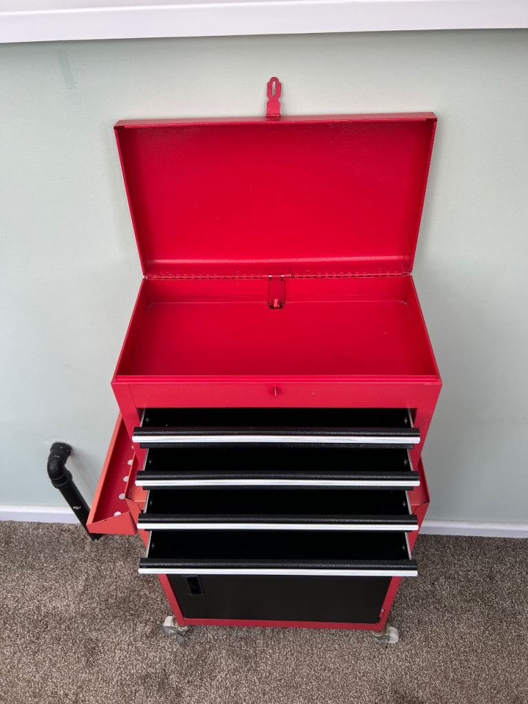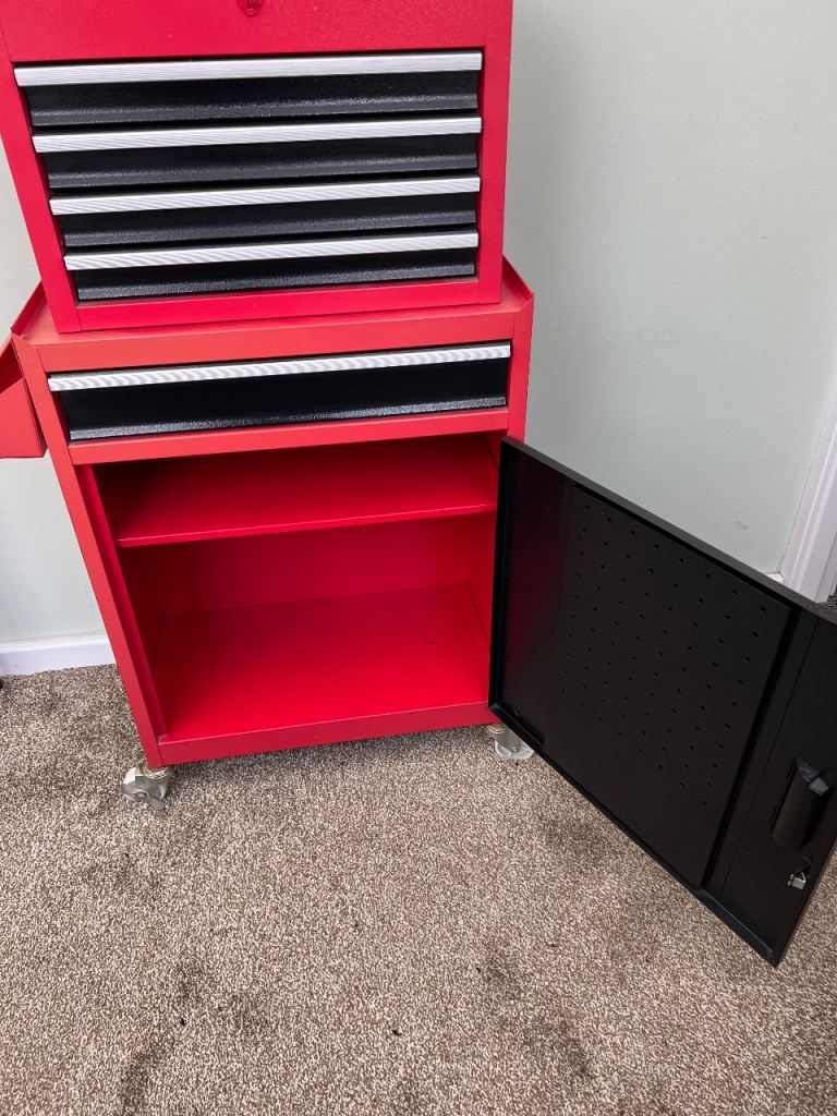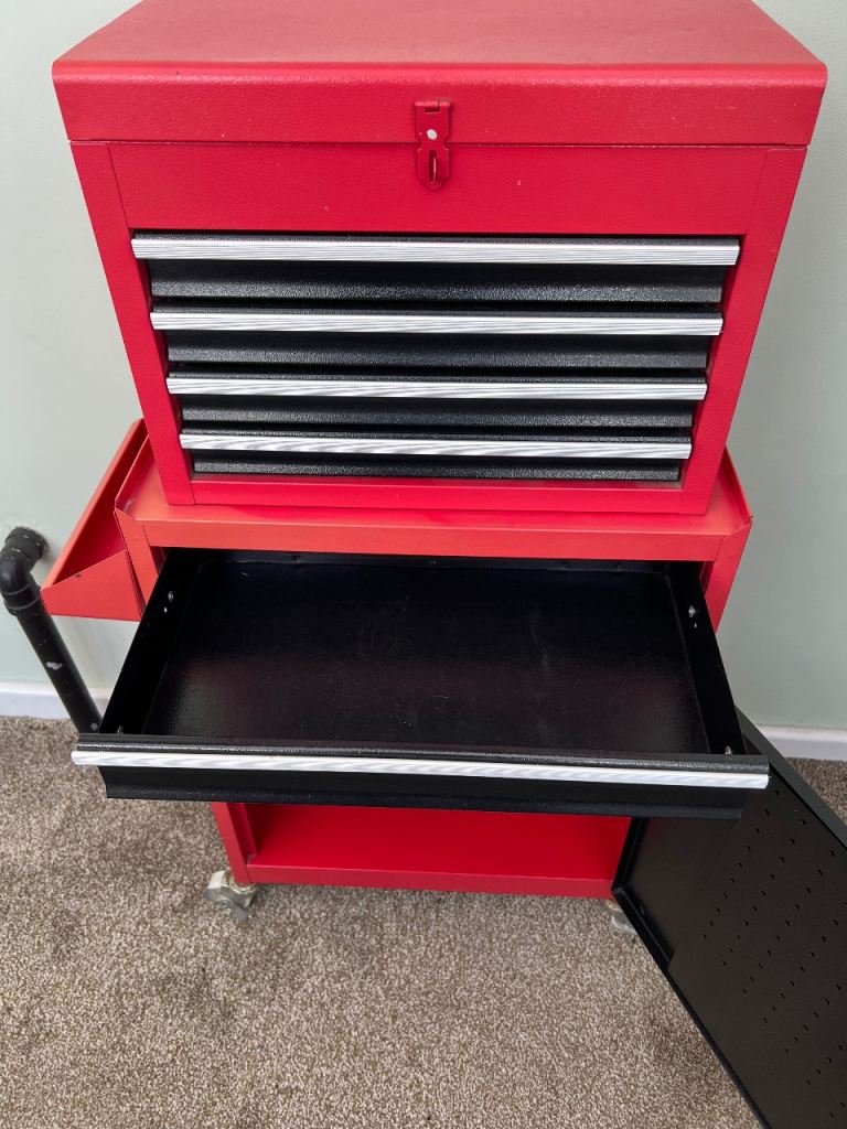 All metal tool chest, top tool box with 4 drawers is removable, cabinet shelf is adjustable, locking wheels
