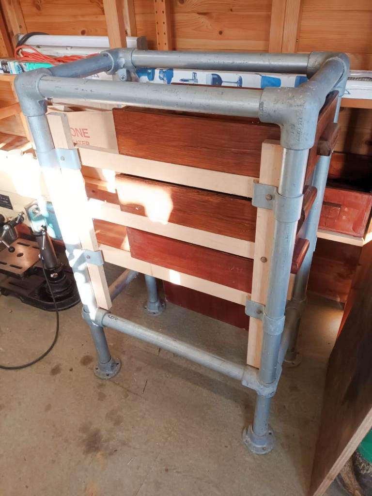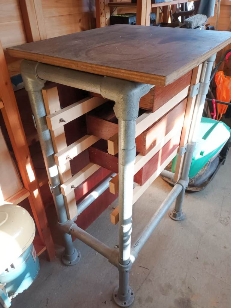 Made out of what appear to be scaffolding poles. Very sturdy and designed to be bolted to a solid floor. Stands approximately 1,090 mm high. It was originally used as the stand for an extremely heavy pillar drill (also for sale). In addition to the metal frame, there is a plywood top (not fixed to the main body) and three small home-made drawers for holding tools and paraphernalia.
