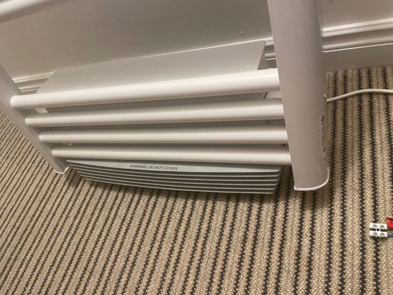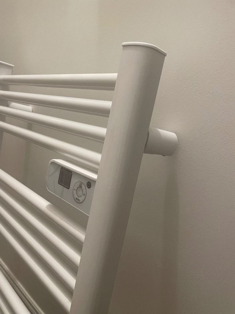 Electric towel warmer with blower fan to heat the bathroom. Good working condition.