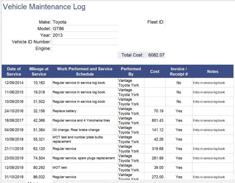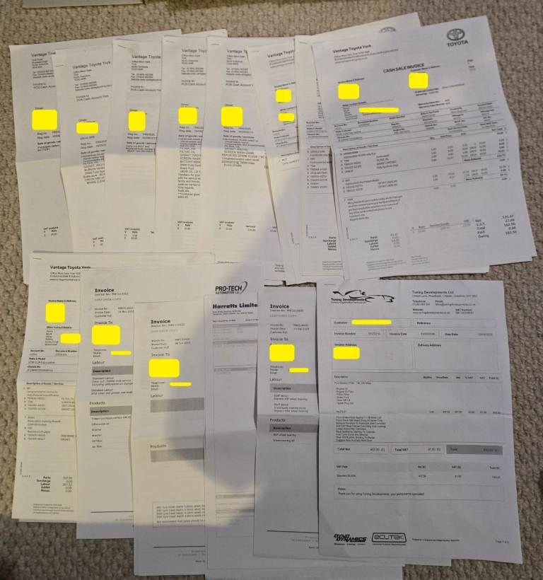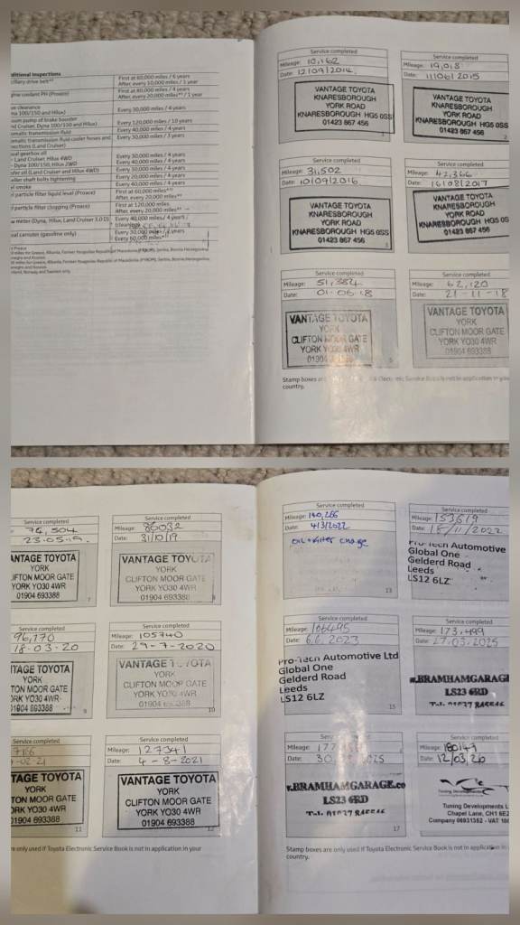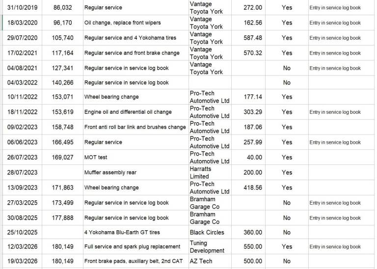 - Specialist History: Full Service History. Main dealer (Toyota) up to 2021; most recent full service and spark plug replacement at Tuning Development (Mar 2026).
