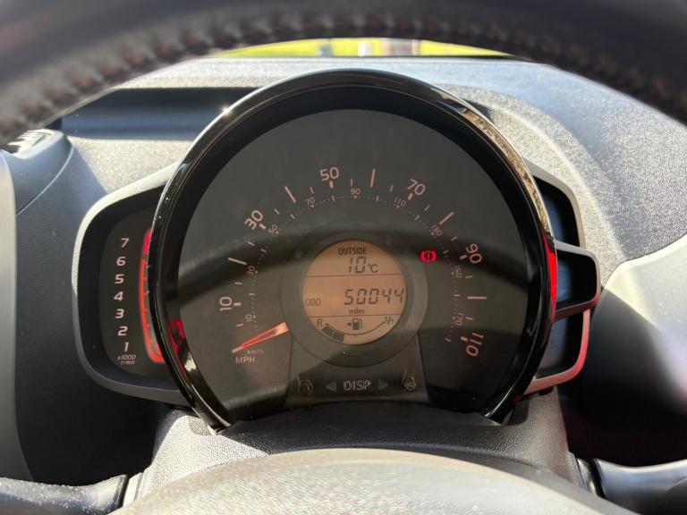 This 2014 Toyota Aygo 1.0 VVT-i x-play Hatchback with a 5-speed manual transmission runs on petrol, has 50000 miles, and comes with a MOT that expires on 15/04/2026. This 5-door, 4-seater vehicle is ULEZ compliant, making it perfect for driving in low emission zones. With 15in steel wheels, black carbon effect diffuser, and body coloured door mirrors and handles, this hatchback is both stylish and practical. Other features include electric and heated door mirrors, ensuring safety and convenience on the road. This Euro 5 compliant car with 68 ps is the perfect blend of efficiency and performance, making it a great choice for anyone in the market for a reliable, fuel-efficient vehicle. Features Include: , 15in steel wheels - 6-spoke, black carbon effect diffuser, body coloured door mirrors, door handles - body coloured, electric and heated door mirrors, front power windows, front x-tension - carbon effect, gloss black front x, intermittent windscreen wipers, rear spoiler, rear window defogger, tyre repair kit, 3-spoke leather steering wheel, air conditioning, air vent surrounds - carbon effect, centre console - steel grey, clean air filter, cupholders - front, cupholders - rear, driver and front passenger sun visors, front console box, gear shift surround - steel grey, glovebox, grey instrument panel, interior light, leather gear shift knob, mirror on sun visors, rear headrests, reclining and sliding front seats, seats - 50-50 split folding rear, seats - drivers height adjustment, steel grey dashboard, steering wheel - audio controls, steering wheel - manual tilt adjustment, steering wheel - multifunction, storage - door pockets, sunvisor - driver and passenger with cover and light, tonneau cover - retractable, abs - anti lock braking system, airbags - curtain, airbags - driver, airbags - front passenger, airbags - front passenger cut-off switch, airbags - front side, ebs - emergency brake signal, hac - hill start assist control, isofix child restraint system, immobiliser, remote central locking, seat belt warning - driver, seat belt warning - front passenger, seat belt warning - rear, vsc - vehicle stability control, am-fm radio, bluetooth connectivity, bluetooth music streaming, front 12v power outlet, speakers x4, usb and aux in, daytime running lights - led, headlights - halogen, high mounted rear brake light, electric power steering - eps, speed limiter, tachometer, tyre pressure warning system
