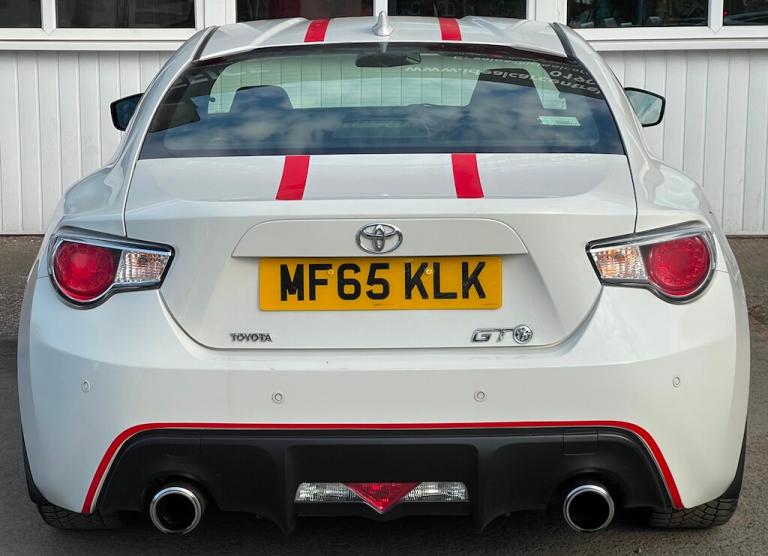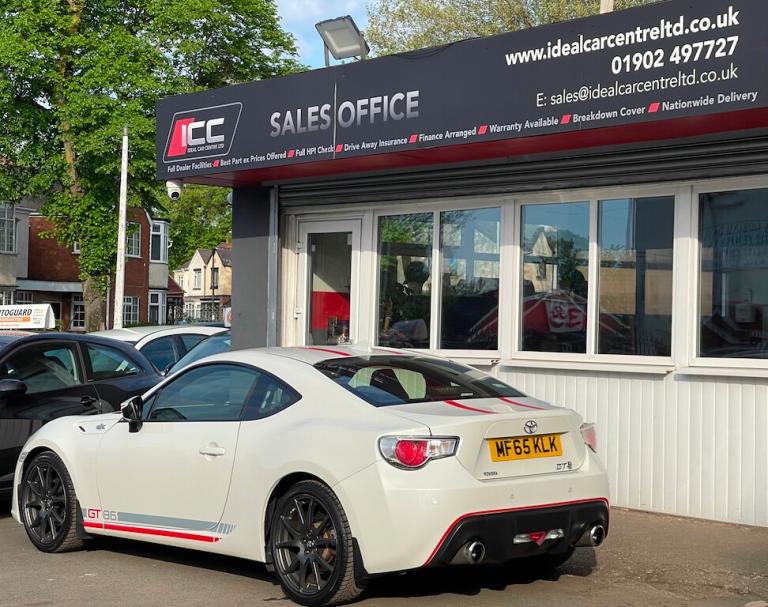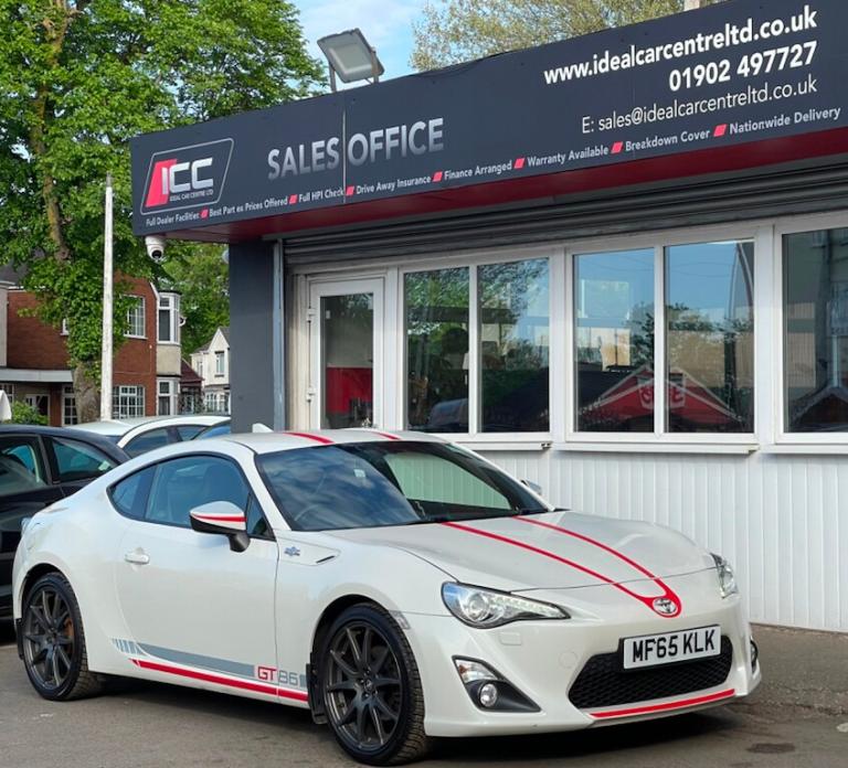 General Vehicle Information Year: 2015 Make: TOYOTA Model: GT 86 D-4S Engine Size: 2.0L Transmission: MANUAL Body Style: COUPE Fuel: PETROL MPG: 44.1 BHP: 197 Registration: MF65KLK Current Mileage: 42,465 Number of previous owners: 2 Number of keys:2 V5 Doc: Present MOT Expiration Date: New 12 month MOT Service History: Present Road Tax per year: £395.00 Euro Emission Standard: EURO 6 Service History Service @ 4193 – 31/08/16 – Toyota Service @ 9569 – 17/08/17 – Toyota Service @ 14511 – 22/08/18 – Toyota Service @ 24132 – 17/08/21 – Toyota Service @ 28587 – 22/08/22 – Toyota Service @ 33982 – 11/08/23 - Toyota !!! READY TO DRIVE AWAY TODAY !!! Don't let it get away! Hold this vehicle with a fully refundable £99 deposit reserve online or call and speak to our sales manager READY TO DRIVE AWAY Vehicle Specification: Top 5 Features: DUAL EXHAUST EXITS WITH DIFFUSER FULL LEATHER SEATS VSC SPORT CARBON FIBRE TRIM ON THE INTERIOR RED STITCHING Exterior Spec: RED RACING STRIPES GT86 LOGO TRIMLESS DOOR FRAME Interior Spec: A/C, ELECTRIC TAILGATE HEATED SEATS CRUISE CONTROL REAR PARKING SENSORS service history: Vehicle Purchase Price: £15,295.00 Full Dealer Facilities Buy with confidence All of our vehicles undergo a comprehensive multi-stage quality and safety assurance inspection, ensuring each vehicle meets our high preparation standards before they go on sale. Every aspect of your vehicle is inspected, including: Vehicle Exterior Bodywork, Vehicle Interior Condition, Brake Discs, Pads, Shoes & Drums, Oil Leaks, Gearbox Operation, Steering, Suspension, Engine Performance, Exhaust Condition, Wheel Balance/Tracking Tyre Depths & Pressures, Electrical Systems, Road Test, Many more. Will also come with a up to date service and new 12 month MOT if required. Buy a car online from the comfort of your home No matter where you are, we’ve made it really easy to buy a car online in 3 simple steps. 1:Choose your car Reserve online for £99 or speak to our contact center you can also request a personalized video. 2:Paperwork and payment made easy Complete your deal online, including part-exchange and any finance. 3:Choose your delivery option Contactless Click & Collect and home delivery available. FOR MORE INFO PLEASE CALL OUR SALES TEAM We are open 6 days a week Monday- Saturday 9:00am till 6:00pm. Appointments only Click and Collect Service Available Open to Inspection and Viewing HPI Checks Done on all Vehicles Nationwide Delivery Available England, Scotland and Wales Extended Warranty Available up to 6,12 or 24 Months Warranty policies to suit our individual needs. Talk to one of our highly trained sales Managers to decide what suits you best. Driveaway Cover Available Part Exchange Available Brake down cover Available For more information please call our office on [Phone number removed] or 01902497727 or visit our website / social media @idealcarcentreltd for more photos and info.. 18in Alloy Wheels - 10-Spoke Anthracite,3-Spoke Leather Steering Wheel,ABS - Anti Lock Braking System,Airbags - Curtain,Airbags - Driver,Airbags - Driver Knee SRS,Airbags - Front Passenger,Airbags - Front Passenger Cut-Off Switch,Airbags - Front Side,Aluminium Sports Pedals,Aux Input,Aux-USB Connectivity for MP3 and iPod Connectivity,BAS - Brake Assist System,Blanco Decals on Side-Bonnet-Roof-Mirror-Diffuser,Bluetooth Connectivity,Bluetooth Music Streaming,Bumpers - Body Coloured,Cruise Control,Daytime Running Lights - LED,Door Courtesy Light,Door Handles - Body Coloured,Door Mirrors - Electrically Heated and Retractable,Double Wishbone Suspension - Rear,Dual Exhaust Pipe with Chrome Finish,Dual Zone Climate Control,Dusk Sensor,EBD - Electronic Brakeforce Distribution,Electric Power Steering - EPS,Floor Mats with GT86 Logo,Front Fog Lights,Front Map Lights,Front Power Windows,Front Wipers - Twin Speed and Fixed Intermittent,Headlight - Levelling Adjustment,Headlight Washers - Electrically Operated,Headlights - High Intensity Discharge,Illuminated Entry System,Individually Numbered Special Edition Plaque,Keyless Entry System with Push Button Start,LSD - Limited Slip Differential,Leather Handbrake Lever,MacPherson Strut Front Suspension,Mud Flaps - Front and Rear,Pollen Filter,Push Button Start,Radio and CD Player,Remote Boot Release,Scuff Plates,Seats - Anti-Whiplash Design,Seats - Front Sport,Seats - Heated Front,Shark Fin Antenna,Side Impact Beams,Side Stripe Decals,Speakers x6,Steering Column - Tilt and Telescopic,Steering Column Lock,Sunvisor - Driver and Passenger with Cover and Light,TPMS - Tyre Pressure Monitoring System,Thatcham Category 1 Alarm System,Touch Screen - 6.1in,Toyota Touch Audio System,Traction Control - TRC,Transponder Key Engine Immobiliser,Trip Computer,Tyre Repair Kit,VSC - Vehicle Stability Control,Vanity Mirrors - Driver and Front Passenger with Cover