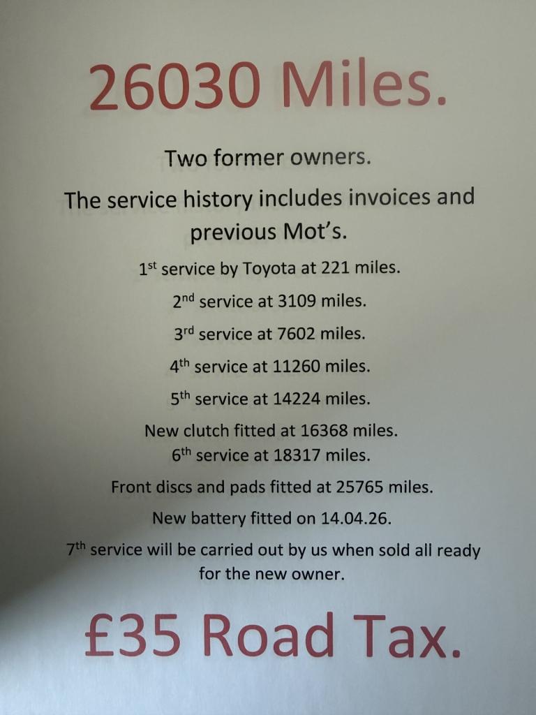THIS CAR IS IN THE QUE FOR AN INTERIOR AND EXTERIOR VALET AND MULTIPLE IMAGES WILL BE ADDED NEXT WEEK. Toyota Yaris 1.3 Icon, 5 door hatchback. Just 2 previous owners and comes with 2 keys, full service history X7 and only 26030 miles from new. Only £35 for 1 year's road tax. The service history is all backed up with invoices and previous Mot's as follows, 1st service by Toyota at 221 miles. 2nd service at 3109 miles. 3rd service at 7602 miles. 4th service at 11260 miles. 5th service at 14224 miles. New clutch fitted at 16368 miles. 6th service at 18317 miles. new front discs and pads at 25765 miles. New battery fitted on 14.04.26. 7th service will be carried out by us when sold all ready for the new owner. Comes with a full Mot and a free warranty. Spec as follows, Remote central locking, Power steering, Radio with steering wheel controls, Alloy wheels, Usb port, Auxiliary connector for an external music device, Bluetooth hands free phone integration with voice control, Reverse camera, Multi-function leather steering wheel, Front fog lights, Front and rear rubber mats, See you home headlights, Electric windows, Air conditioning, Trip computer, Bluetooth music streaming, Hill start assist, Electric and heated door mirrors, Daytime running lights, Alarm, 6 speed gearbox, Traction control, Abs, Isofix child seat anchor points, Rear headrests, Tpms, Height adjustable driver's seat, Adjustable steering column, Multiple air bags. Cars for your family from a small family business established in 1977. Finance available plus debit cards are welcome. We do not charge admin fees. All our cars are Hpi clear and come with a full Mot, 35 point health check plus a free warranty. To view around 30 similar vehicles please click on to our website. Thanks for looking