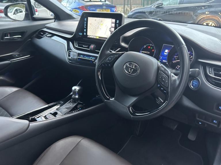 59072 miles. This 2017 Toyota C-HR VVT-h Excel is a standout example, having been cherished by just one owner from new and boasting a full dealership service history right up to September 2024 at 47,188 miles, with an MOT valid until October 2026. This well maintained hybrid is Euro 6 compliant and has a clear vehicle history check, offering peace of mind for its next owner.The Toyota C-HR Excel offers an impressive 74 mpg fuel economy, demonstrating its efficiency. This model also benefits from a low insurance group and low CO2 emissions, which are significant advantages that set it apart from many other vehicles in its class. 12v Socket, Climate Control, Cupholders, Front Electric Windows, Heated Front Seats, Privacy Glass, Rear View Auto Dimming Mirror, Steering Column - Adjustable, Leather Steering Wheel, Satellite Navigation, Power Assisted Steering (PAS), Anti Lock Brakes, Driver Airbag, Electronic Stability Programme (ESP), Front Fog Lights, Front Parking Sensor, Rain Sensitive Wipers, Alarm, Keyless Central Locking, Part Leather/Cloth, Solid Paint, Alloy Wheels.