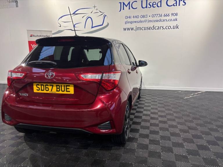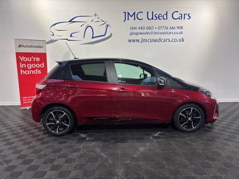 The Toyota Yaris 1.5 VVT-i Blue Bi-Tone Hatchback 5dr Petrol Manual Euro 6 is a smart, efficient and reliable small car thats ideal for both city commuting and longer drives. Its peppy 1.5 VVT-i engine delivers smooth performance with excellent fuel economy, while the manual gearbox gives you good control and an engaging drive. The bi-tone design adds stylish appeal, and the well-built interior feels comfortable and practical for everyday use. Overall, its a dependable, economical choice with Toyotas strong reputation for durability. Award-Winning Family Business Premium Customer Service & Aftercare Located just off Junction 24 of the M8 in Glasgow, we offer an impressive range of quality used cars, all displayed in our indoor showroom. Each vehicle is meticulously prepared to meet our high standards, ensuring youre driving away with complete confidence. We welcome part exchanges and offer tailored finance and warranty packages to suit every budget. Need help choosing the right car? Our team is here to provide expert advice and support. Cant make it in person? No problem! We offer live video walkarounds of our cars upon request, and you can complete all finance agreements securely online. For more details or to arrange a viewing, contact Martin today. JMC USED CARS WWW.JMCUSEDCARS.CO.UK [Email address removed. Click Email button to contact us.] YEAR MOT, REVERSE CAMERA, DAB RADIO, BLUETOOTH, LOW RATE FINANCE AVAILABLE, Parking Pack, 16in Alloy Wheels - 5 Double-Spoke - Machine Faced, 3-Spoke Leather Steering Wheel, 4.2in Coloured TFT Multi-Information Display, 60-40 Split-Folding - 2nd Row - Rear Seats, Adjustable Speed Limiter -ASL- Switch on Steering Wheel, Analogue Speedometer, Analogue Tachometer, Anti Lock Braking System - ABS with Electronic Brake-Force Distribution - EBD, Audio Switches on Steering Wheel, Auto Up and Down Function on Drivers Window, Automatic High Beam, Bluetooth Connectivity, Boot Lamp, Child Safety Locks on Rear Doors, Cruise Control, Cruise Control Switch on Steering Wheel, DAB Digital Radio, Daytime Running Lights - LED, Door Handles - Body Coloured, Door Mirrors - Black, Driver and Front Passenger Personal Lights, Driver and Front Passenger Whiplash Injury Lessening - WIL - Seats, Electric Power Steering - EPS, Electric and Heated Door Mirrors, Emergency Brake-Light Signal - EBS - Hazard Type, Follow Me Home Headlights, Front 12V Power Outlet, Front Fog Lights, Front Passenger Airbag On-Off Switch, Front Power Windows, Front and Rear Cupholders, HAC - Hill Start Assist Control, Headlight Cut-Off Reminder, Headrests - Rear Height Adjustable, High Mounted Rear Brake Light - LED, Honeycomb Lower Front Grille, ISOFIX Fixing Points, Illuminated Entry System, Immobiliser, Key Reminder Warning, LED Rear Brake Lights, LED Rear Combination Lights, Lane Departure Alert, Leather Parking Brake, Manual Tilt and Telescopic Adjustable Steering Wheel, Multi-Information Display Switches on Steering Wheel, Parcel Shelf, Pre-Collision System, Projector Headlights, Rain Sensing Wipers, Rear Power Windows, Rear Privacy Glass, Rear Spoiler, Rear Window Defogger, Remote Door Locking, Reversing Camera, Road Sign Assist, Seat Belt - Pre-Tensioners and Force Limiters, Seat Belt Reminder - Front and Rear, Seats - Drivers Height Adjustment, Speakers x6, Supplemental Restraint System - SRS - Airbags - 7 Airbags, TPMS - Tyre Pressure Monitoring System, Temporary Spare Wheel, Toyota Safety Sense, Toyota Touch 2, Traction Control - TRC, Turning Signal Integrated in Door Mirrors, USB Connection, VSC - Vehicle Stability Control