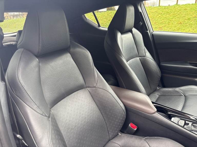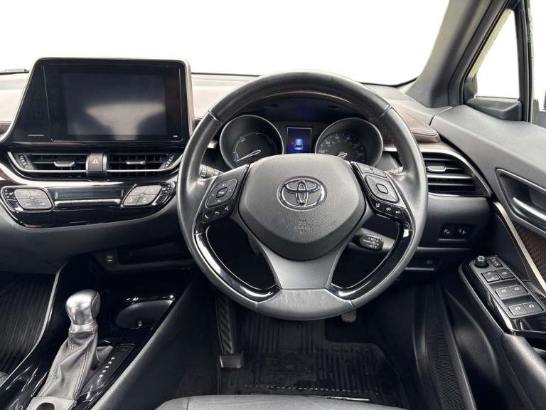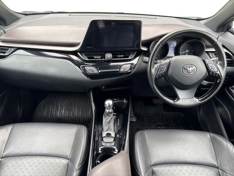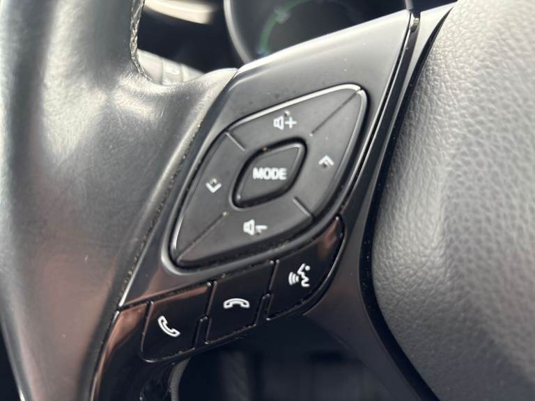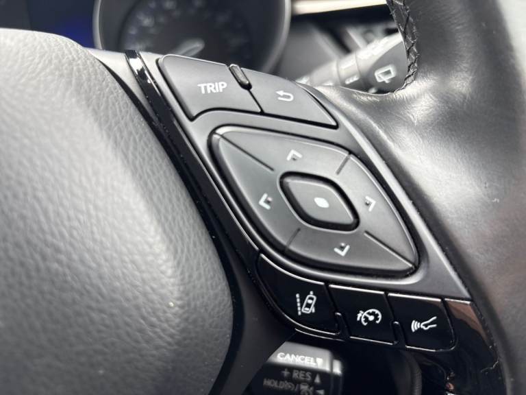 ..4.2'' Colour TFT driver information display, 8'' touch screen, Adaptive cruise control, Adjustable speed limiter, Bluetooth system, Collision prevention assist, Lane change assist and blind spot monitor, Lane departure warning system, Lights on warning, PAS, Rear cross traffic alert, Reversing camera, Touch 2 Go navigation system, Traffic sign recognition, Trip computer, Vehicle Stability Control (VSC), 6 speakers, Auxiliary input socket, DAB Digital radio, Steering wheel mounted controls, USB connection, Auto dimming rear view mirror, Auto folding mirrors, Auto high beam, Body colour door handles, Body colour heated door mirrors, Body coloured bumpers, Electric folding/heated door mirrors with integrated indicators, Follow me home headlights, Front and rear electric windows, Front fog lights, Heated rear windscreen, LED daytime running lights, LED rear lights, Privacy glass, Rain sensitive windscreen wipers, Rear spoiler, Rear wiper, Shark fin roof aerial, 12V Accessory socket, Ambient lighting, Child seat anchorage points, Chrome interior door handles, Driver/passenger sunvisors and illuminated vanity mirrors, Dual zone automatic air conditioning, Folding rear seats, Front and rear door pockets, Front centre armrest, Front cupholders x 2, Front head restraints, Glovebox illumination, Heated front seats, Height adjustable drivers seat, Illuminated door sills, Illuminated entry system, Leather gear knob, Leather upholstery, Lumbar support, Nappa leather steering wheel, Rear headrests, Tilt/telescopic steering column, Whiplash Injury Lessening (WIL) feature (active headrest) for seats, Parking pack - C-HR, 3x3 point rear seatbelts, ABS+EBD+Brake assist, Airbag deactivation switch, Driver/Front Passenger airbags, Driver/front passenger side airbags, Drivers knee airbag, ESP + traction control, Front and rear curtain airbags, Front and rear seatbelt reminder, Hill start assist control (HAC), Rear child proof door locks, Road sign information display, Toyota safety sense, Tyre pressure monitoring system, Alarm, Immobiliser, Remote central locking, Smart entry, Tyre repair kit