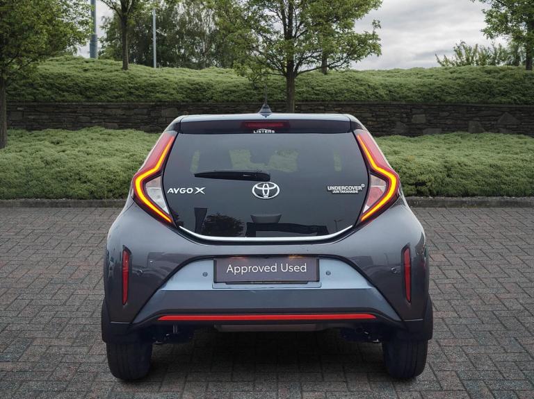 Available from 12/10/2025. Toyota Aygo X Hatchback 1.0 VVT-i Undercover 5dr in Grey. Specification Includes 18in Alloy Wheels - Glossy Black with Coral Red Inserts, 3-Spoke Leather Steering Wheel, 4.2in Colour Multi-Information Display Screen, 9in HD Toyota Smart Connect Multimedia System, ABS - Anti Lock Braking System with Emergency Brake-Light System - EBS, Adjustable Speed Limiter -ASL- Switch on Steering Wheel, Analogue Speedometer, Audio Switches on Steering Wheel, Auto Headlights, Auto Wipers, Automatic Air Conditioning, Automatic Headlight Cut-Off, Automatic High Beam On-Off Switch, Black Door Moulding, Black Surround on Front Fog Lights, Black Wheel Arch Moulding, Bluetooth Connectivity, Body Coloured Insert on Steering Wheel, Boot Door Scuff Plate, Boot Light, Centre Room Light, Child Safety Door Locks, Chrome Interior Door Handles, Chrome Surround on Air Conditioning Button, Clean Air Filter, Connected Navigation, DAB Digital Radio, Digital Tachometer, Door Handles - Body Coloured, Door Mirrors - Gloss Black, Electric Power Steering - EPS, Floor Mats - Bordeaux Border - Chaos-Balance Design with Aygo X Undercover Logo, Follow Me Home Headlights, Front 12V Power Outlet, Front Bumper - Body Coloured, Front Fog Lights, Front LED Light Guide, Front Passenger Airbag On-Off Switch, Front Power Windows, Front Seat Belt Reminder, Gloss Black Upper Front Grille, HAC - Hill Start Assist Control, Headlight Cut-Off Reminder, Headrests - Front - Deco Art, Heated Driver and Passenger Seat, ISOFIX Child Restraint System - 2x Rear, Intelligent Adaptive Cruise Control Switch on Steering Wheel, Key Reminder Warning, LED Daytime Running Lights with LED Light Guide, LED Headlamps, Lane Departure Alert with Switches on Steering Wheel, Light Blue Ambient Lighting in Centre Console, Manual Headlight Levelling, Manual Tilt Steering Wheel, Manually Reclining Driver and Passenger Seat, Manually Sliding Driver and Passenger Seat, Multi-Info Switches on Steering Wheel, Parking Pack, Pollen Air Filter, Power Back Door, Power-Adjustable - Electric - Heated Door Mirrors, Pre-Collision System with Emergency Steering Assist, Privacy Glass - Rear Side Windows, Rear Headrests x2, Rear Seat Belt Reminder, Rear Window Defogger - De-Icer, Rear Window Wiper, Remote Power Door Locks, Reversing Camera, Roof - Head Lining Adhesive Head Lining, Seats - 50-50 Split Folding Rear, Seats - Drivers Height Adjustment, Short Antenna, Smart Entry and Start, Smartphone Remote Hazard Lights,
